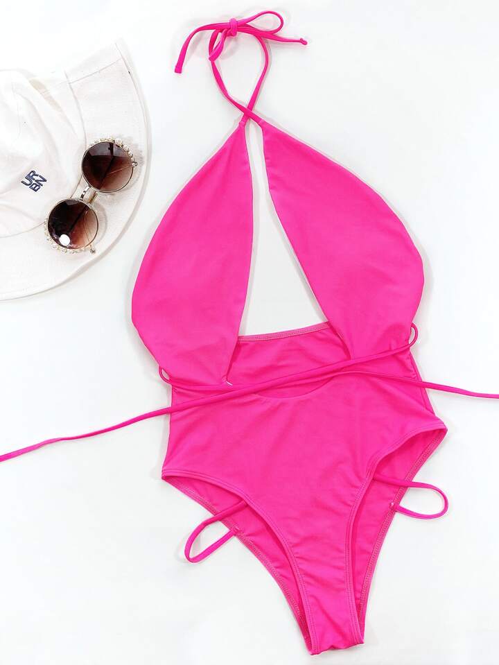 Plain Cut-Out Criss Cross Halter One Piece Swimsuit, For Summer Beach Vacation