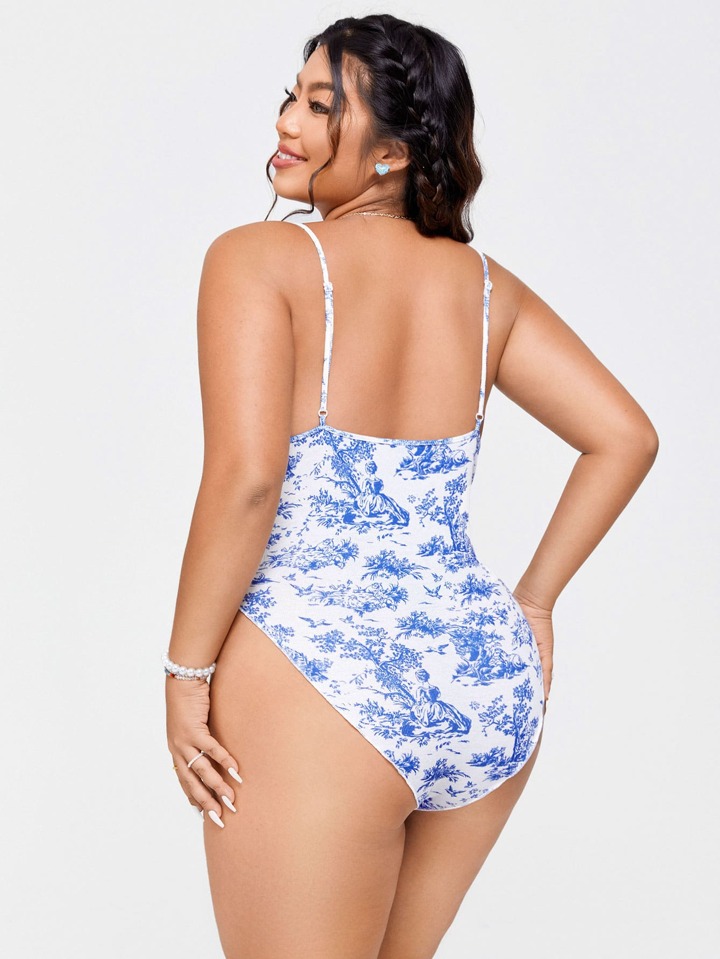 Plus 1pc Plant & Figure Graphic Ruched Cami Bodysuit