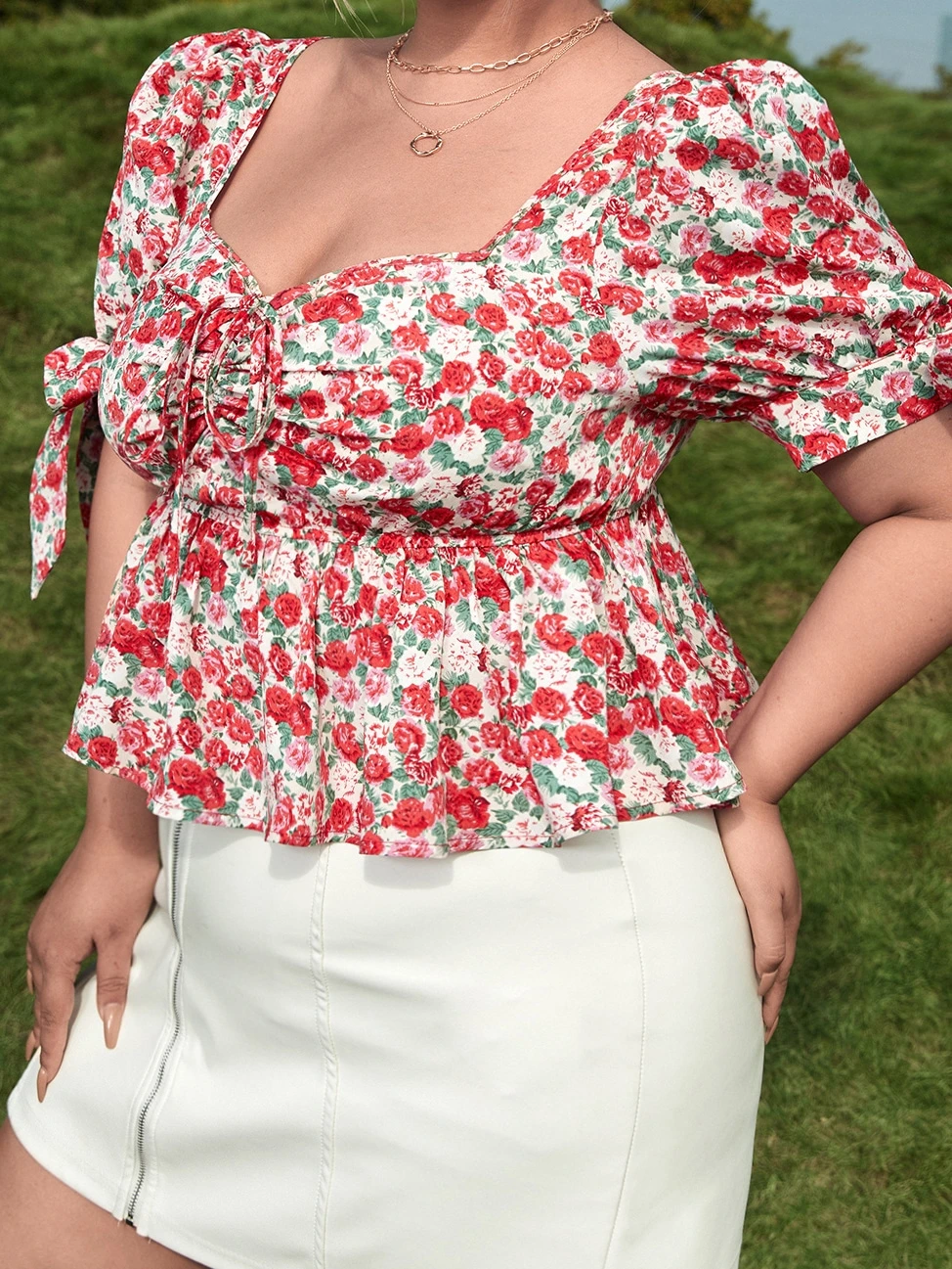 Plus Allover Floral Print Lace Up Ruffle Hem Blouse