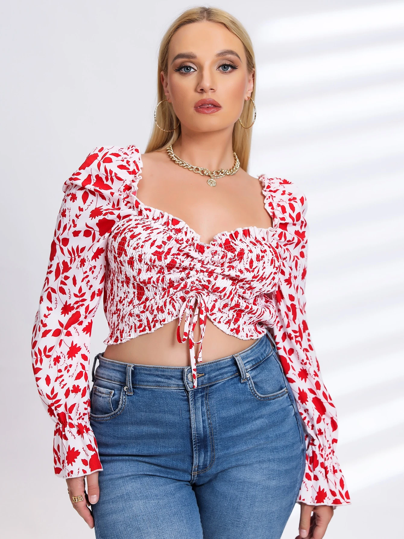 Plus Allover Plants Print Drawstring Front Flounce Sleeve Crop Shirred Top
