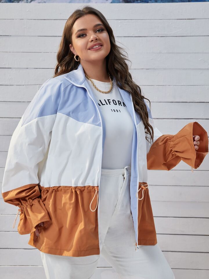 Plus Color Block Flounce Sleeve Drawstring Waist Coat