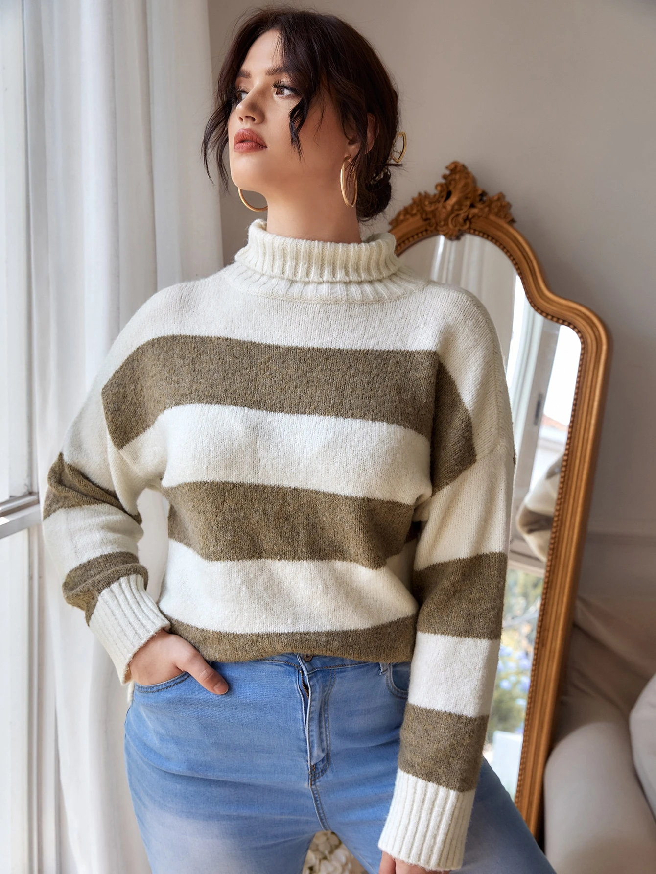 Plus Color Block Turtleneck Drop Shoulder Sweater