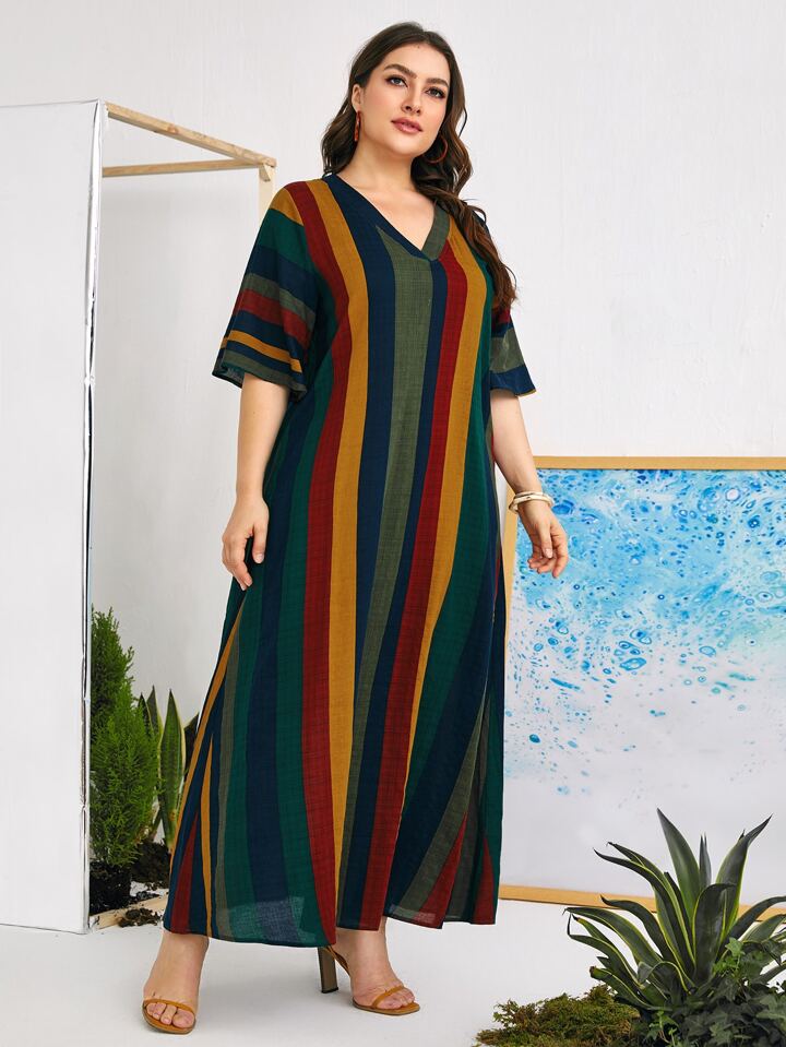 Plus Colorblock Striped Print V Neck Maxi Tunic Dress
