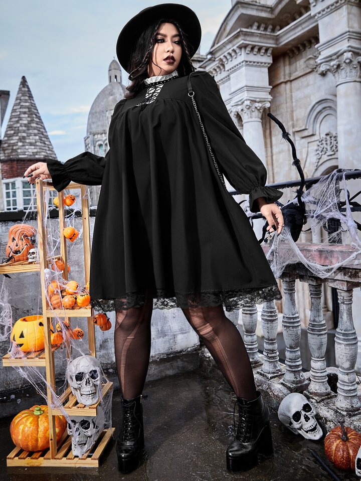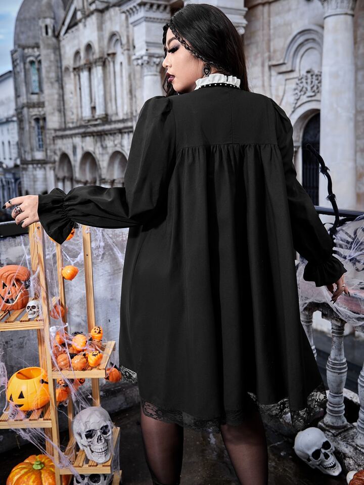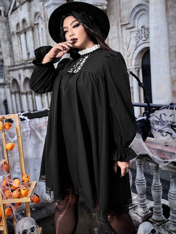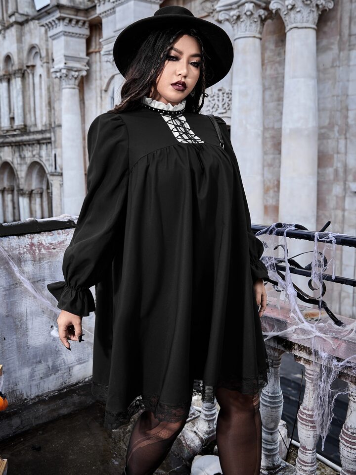 Plus Contrast Panel Frill Mock Neck Flounce Sleeve Lace Trim Dress