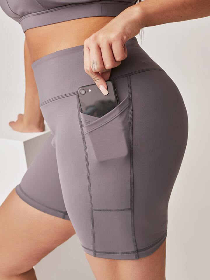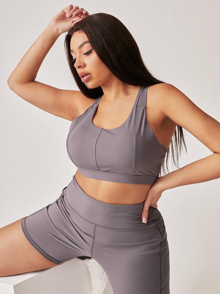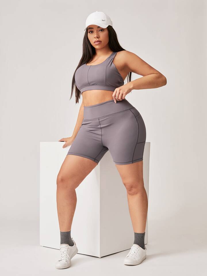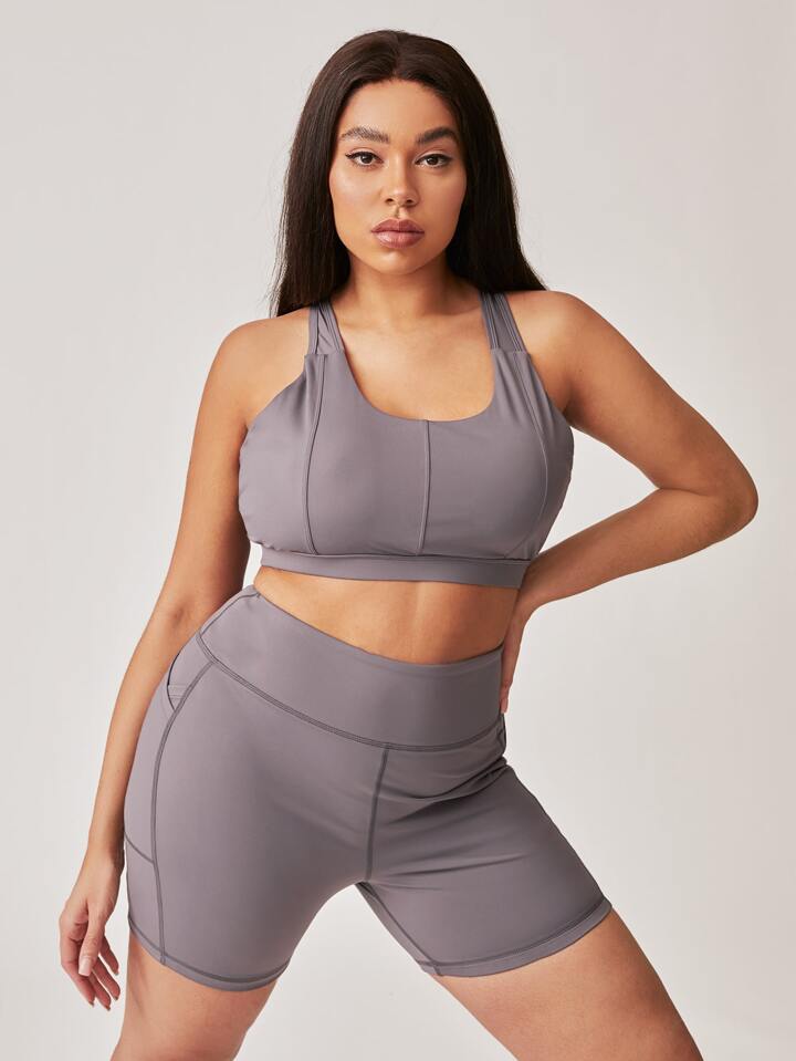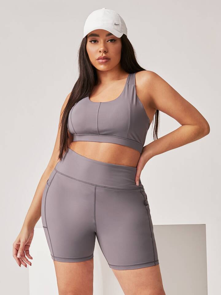 Plus Cut Out Back Solid Sports Bra & Phone Pocket Shorts Set