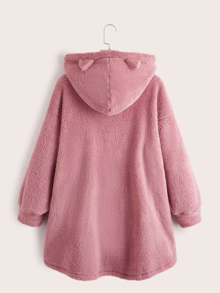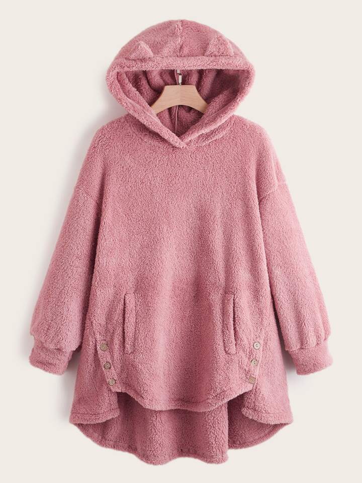 Plus Drop Shoulder High Low Hem 3D Ears Design Flannel Hoodie