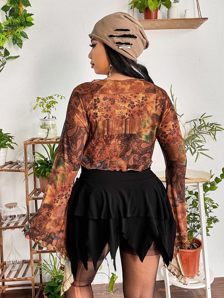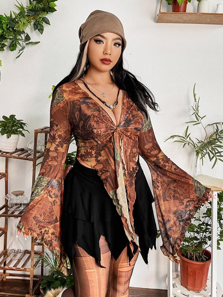 Plus Floral & Paisley Print Knot Front Trumpet Sleeve Mesh Top, School