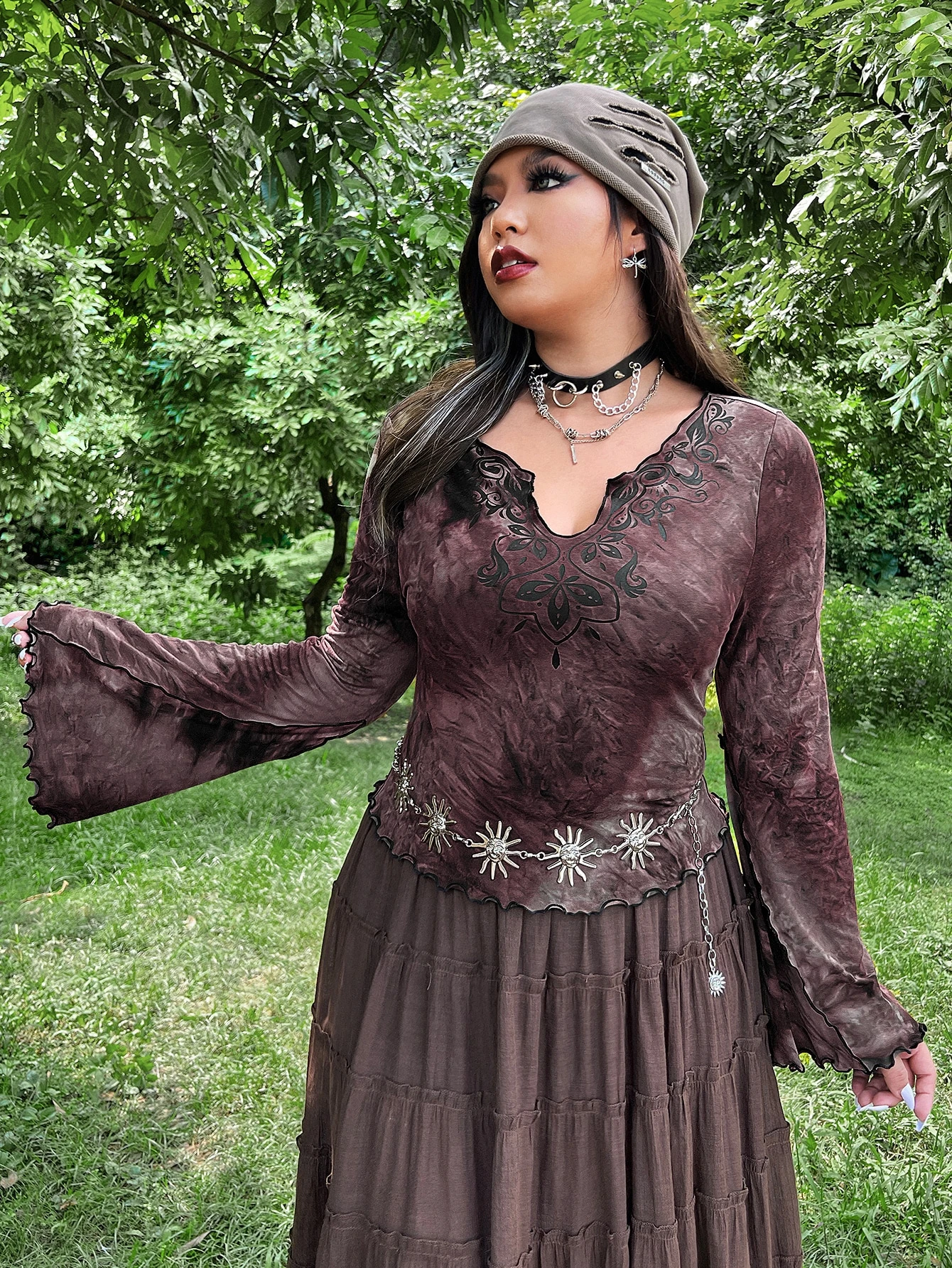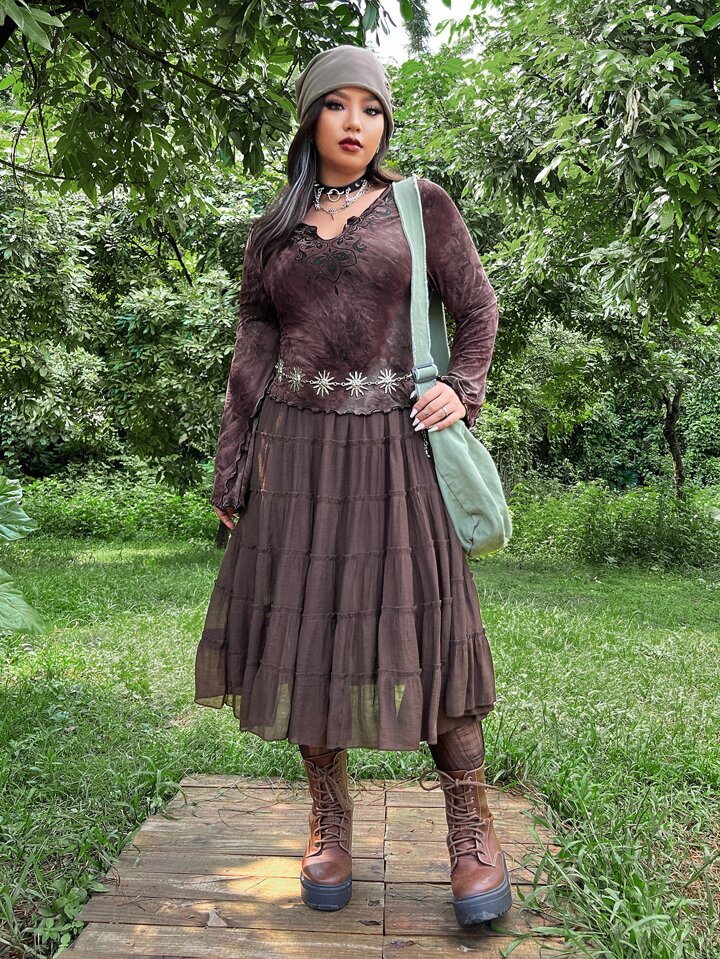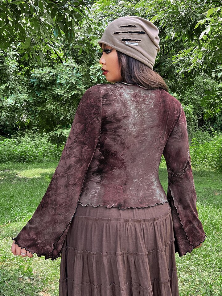 Plus Floral Pattern Tie Dye Lettuce Trim Flounce Sleeve Tee Without Belt
