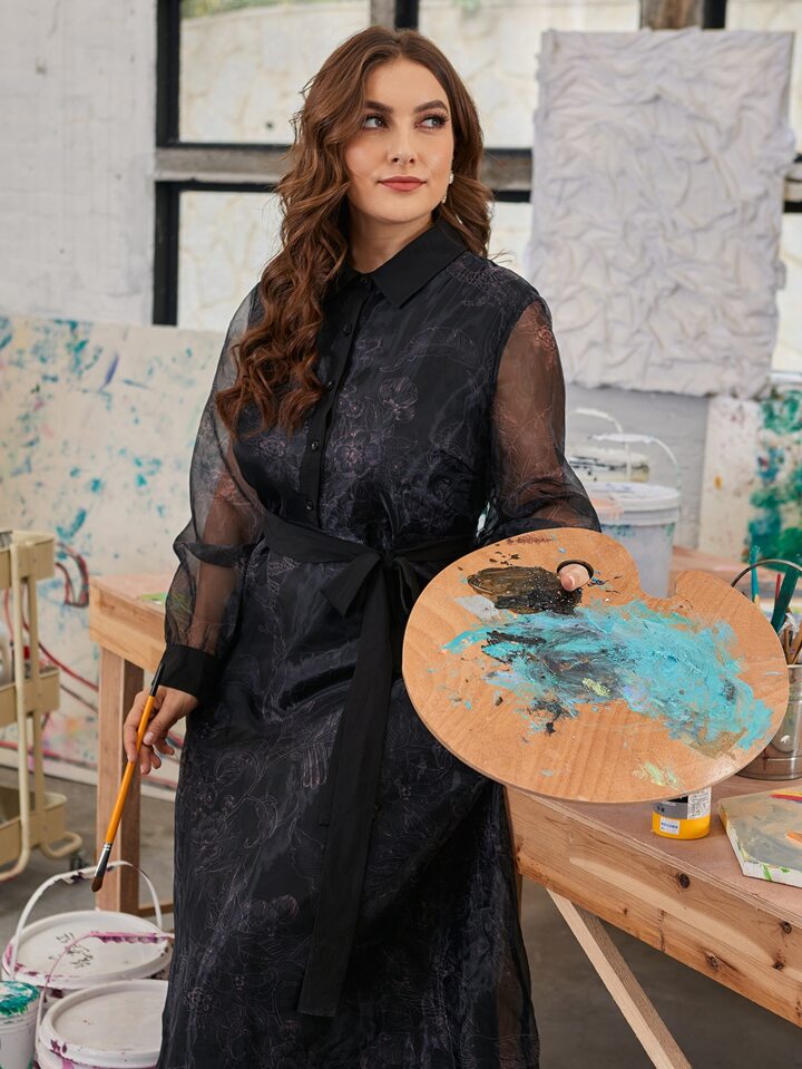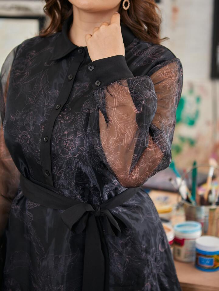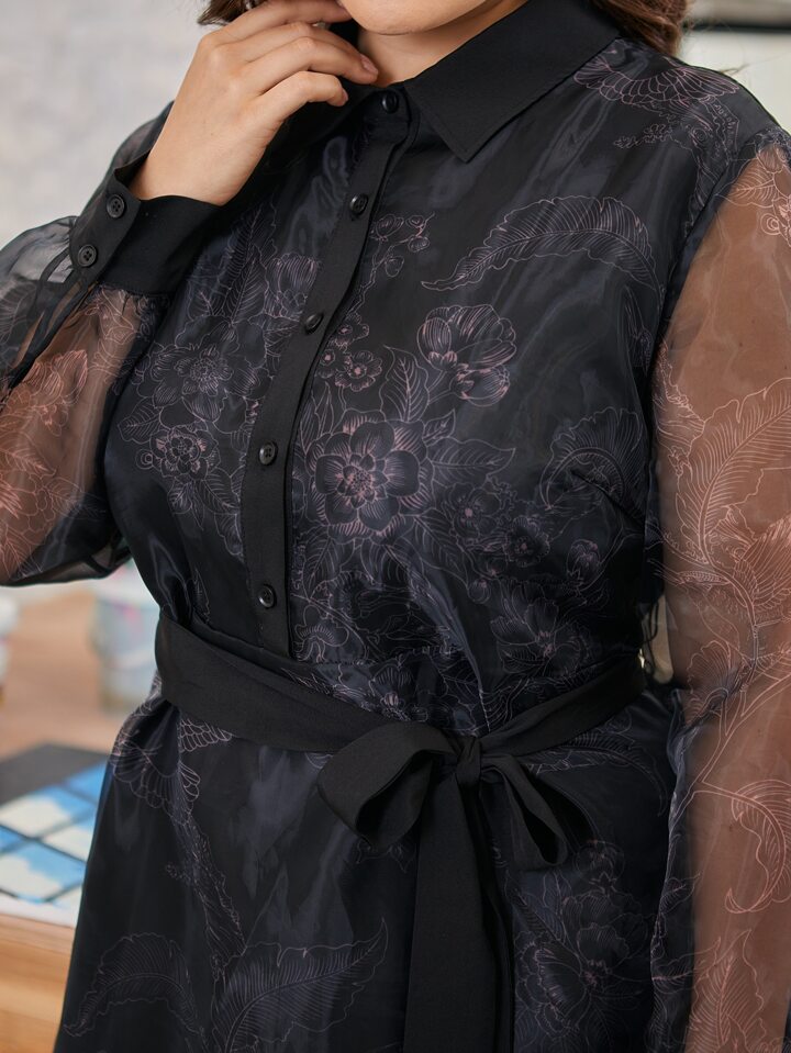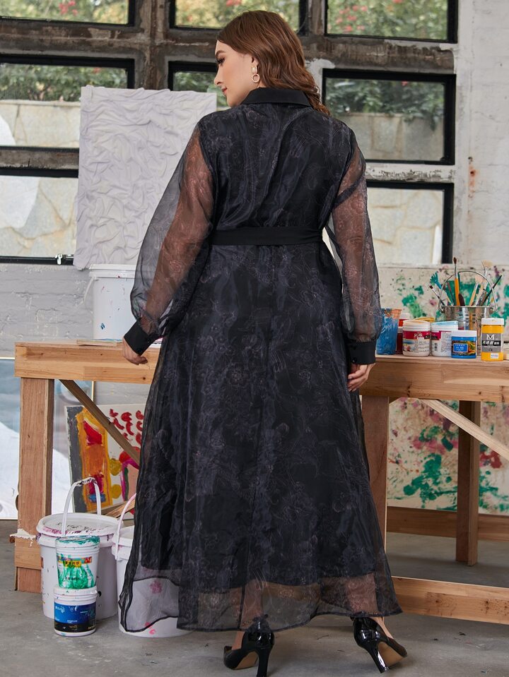 Plus Floral Print Belted Organza Overlay Dress