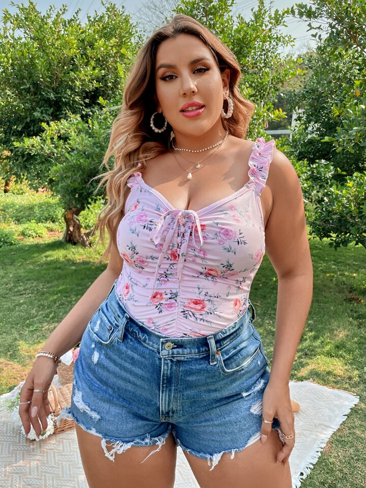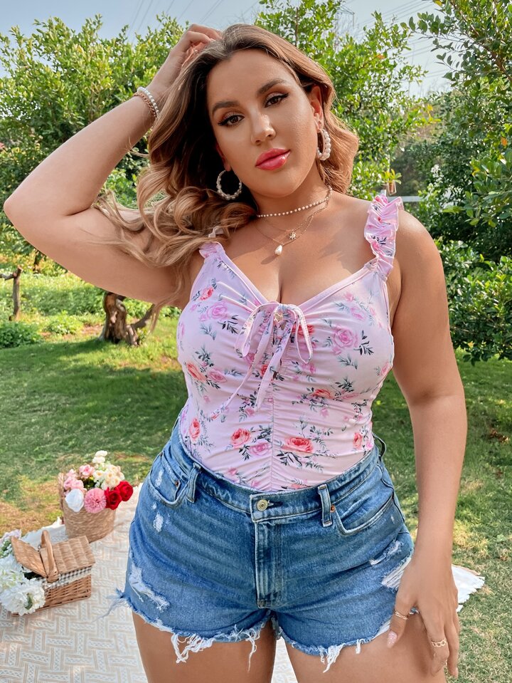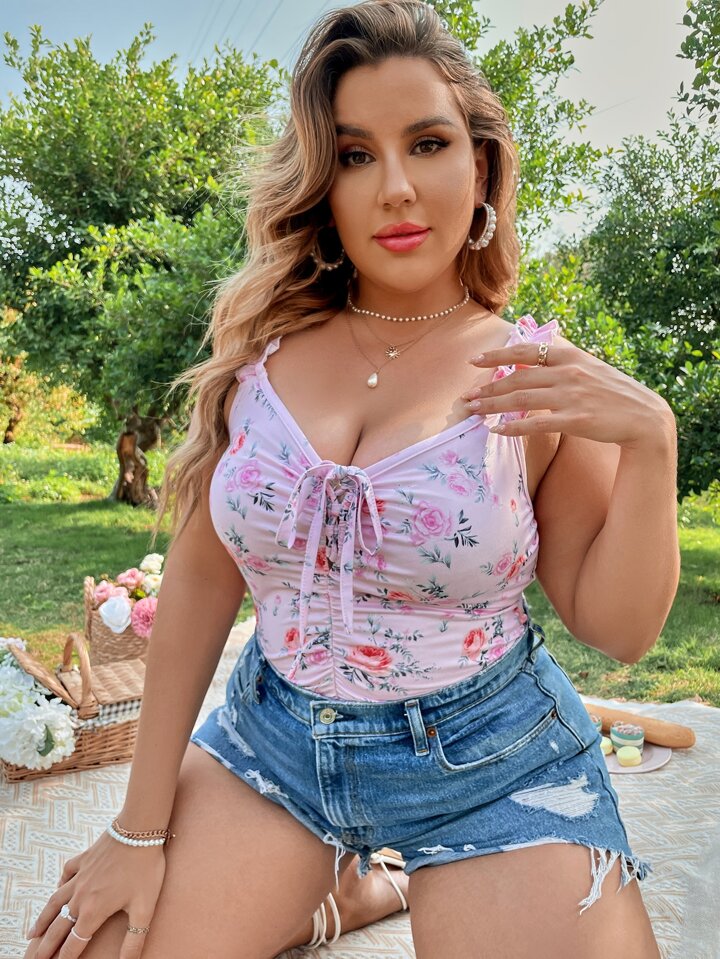 Plus Floral Print Tie Front Ruffle Trim Cami Top