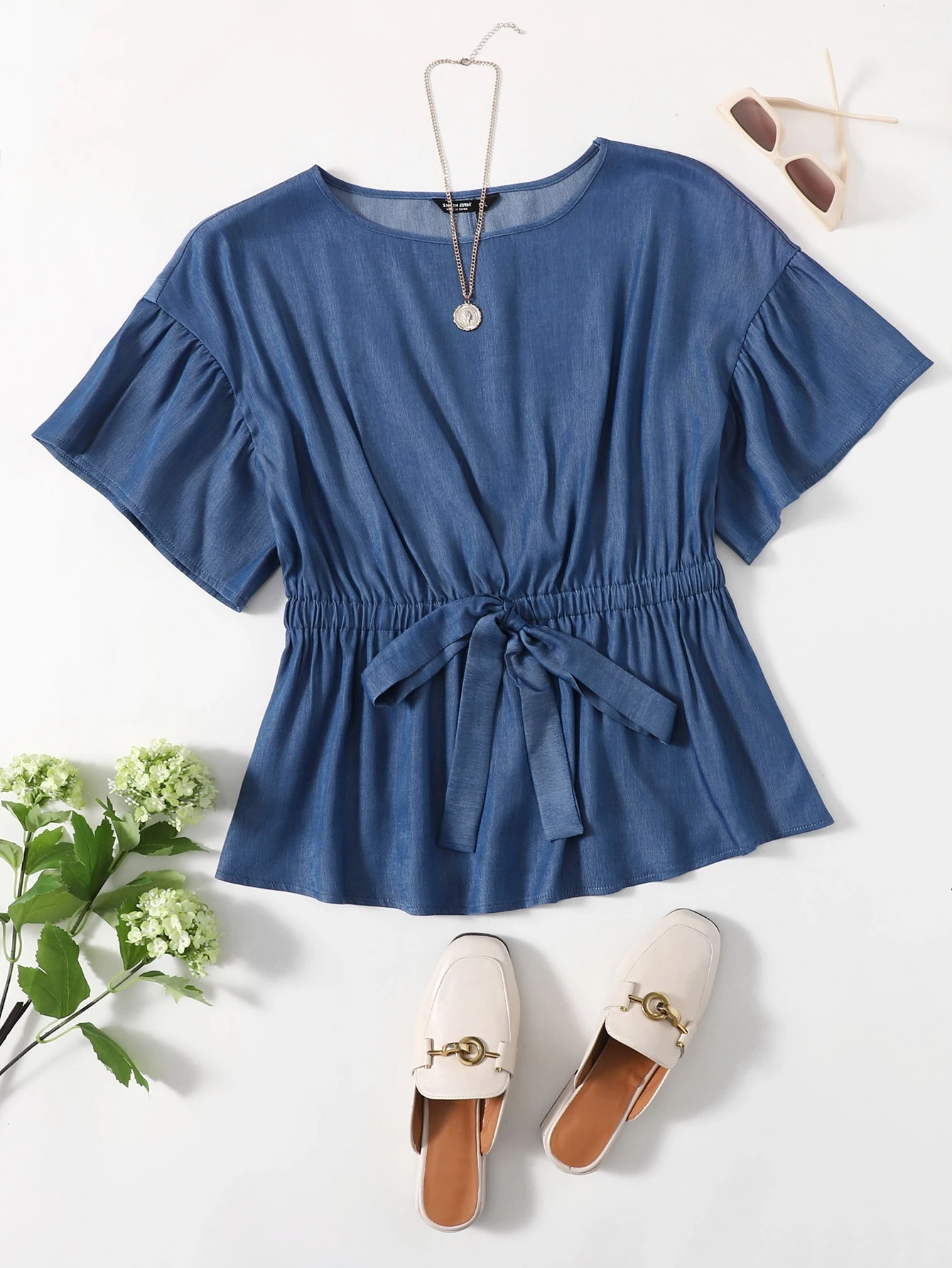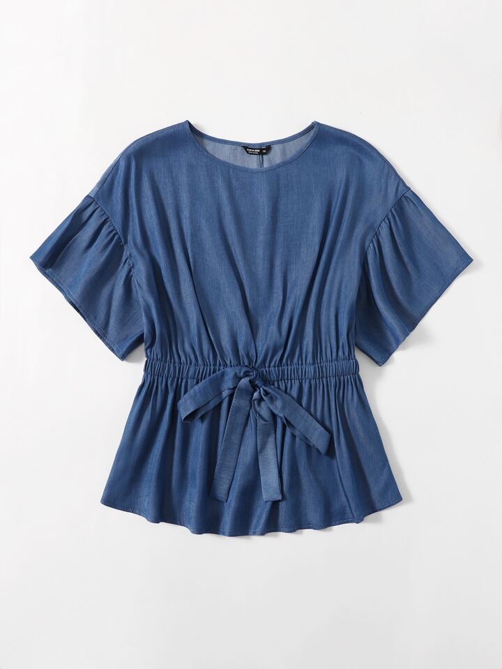 Plus Flounce Sleeve Tie Front Top Women Summer Solid Color Blouse