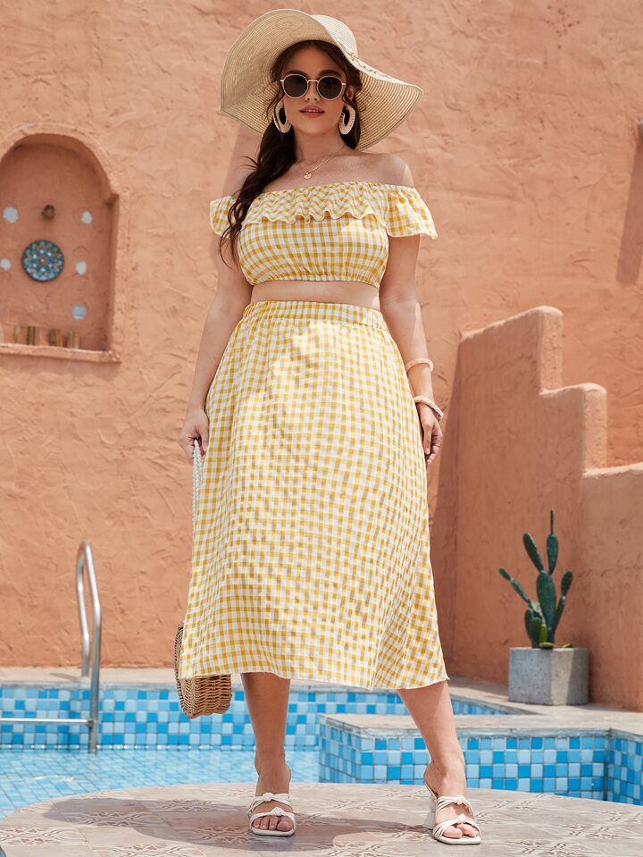 Plus Gingham Off-shoulder Top & Skirt