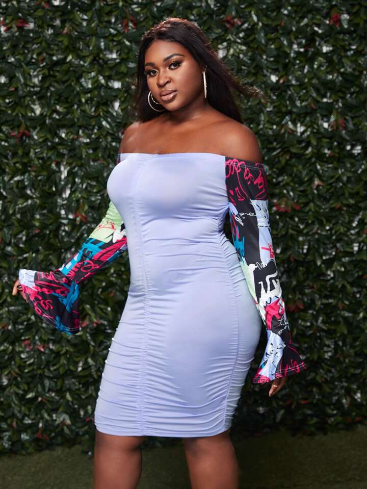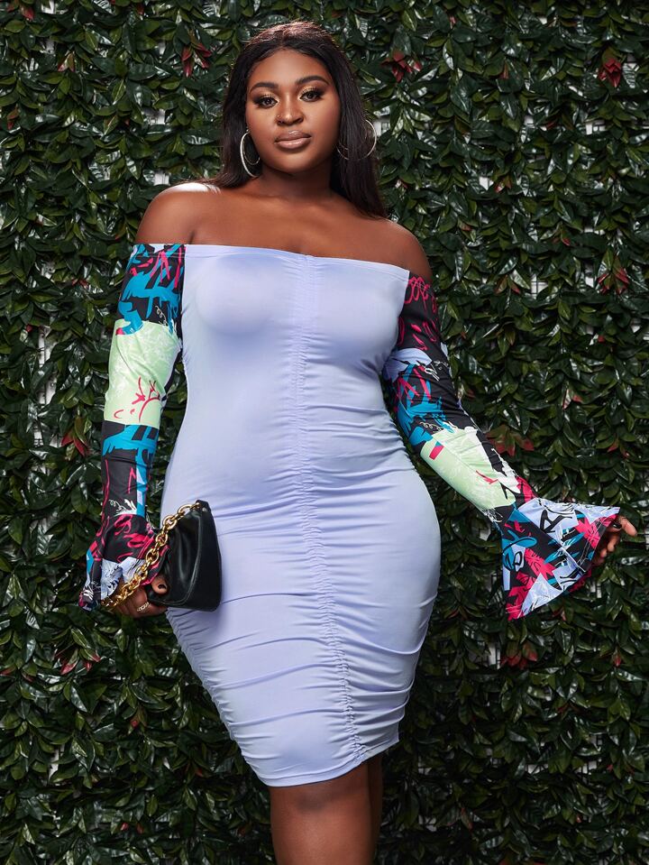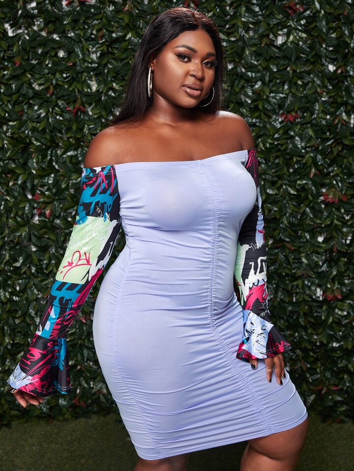 Plus Graffiti Print Off Shoulder Flounce Sleeve Bodycon Dress