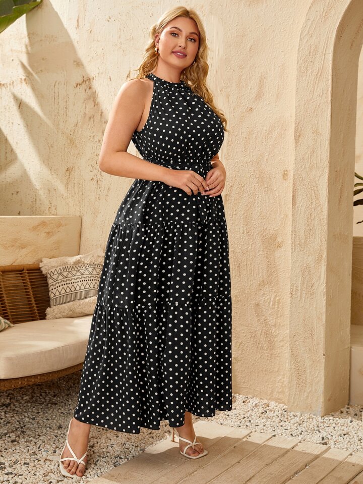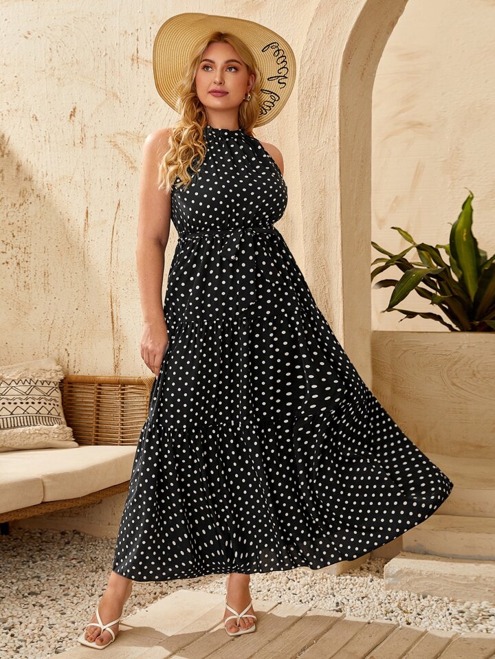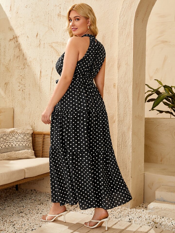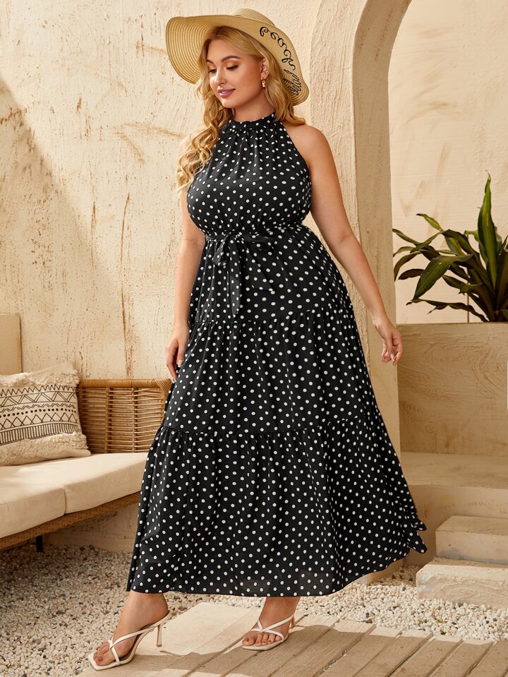 Plus Halterneck Belted Ruffle Hem Polka Dot Dress