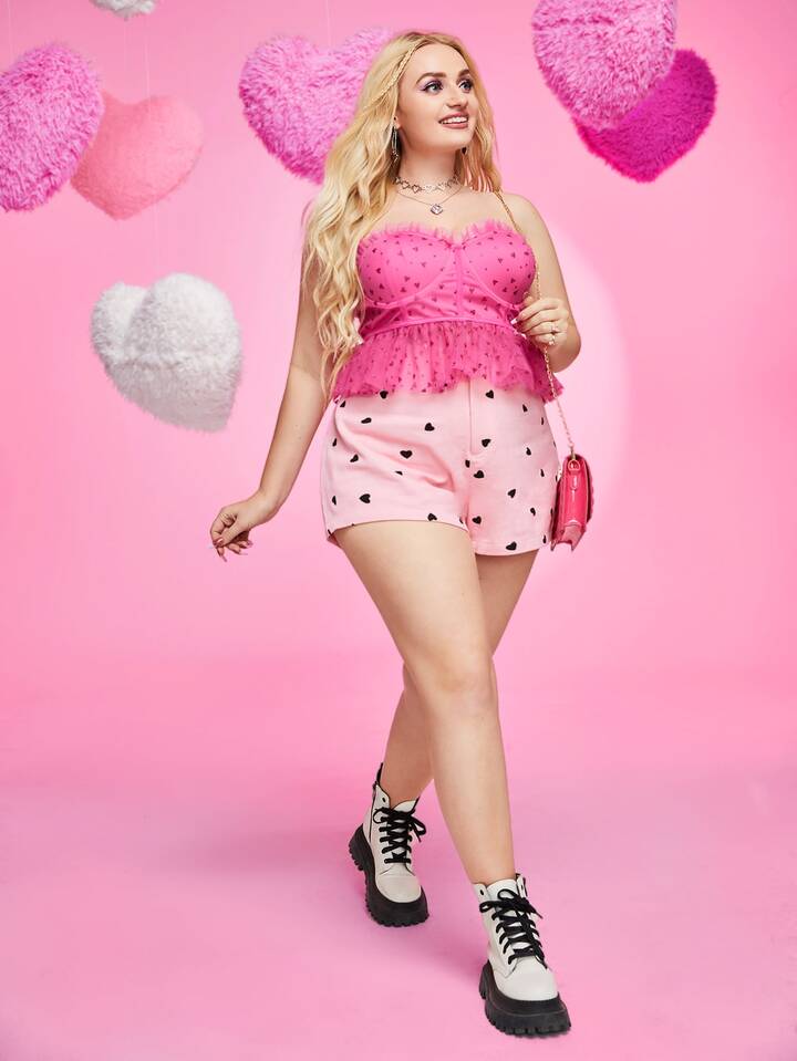 Plus Heart Print Mesh Frill Trim Peplum Top