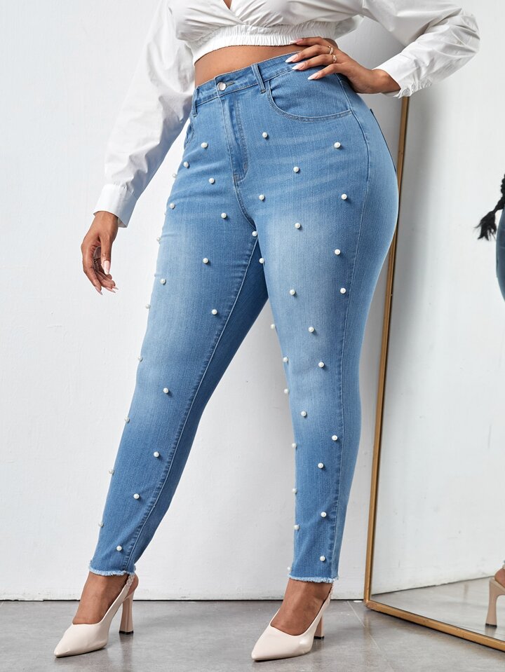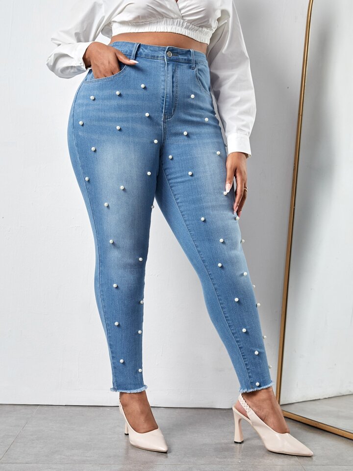 Plus High Waist Pearls Beaded Raw Cut Skinny Jeans