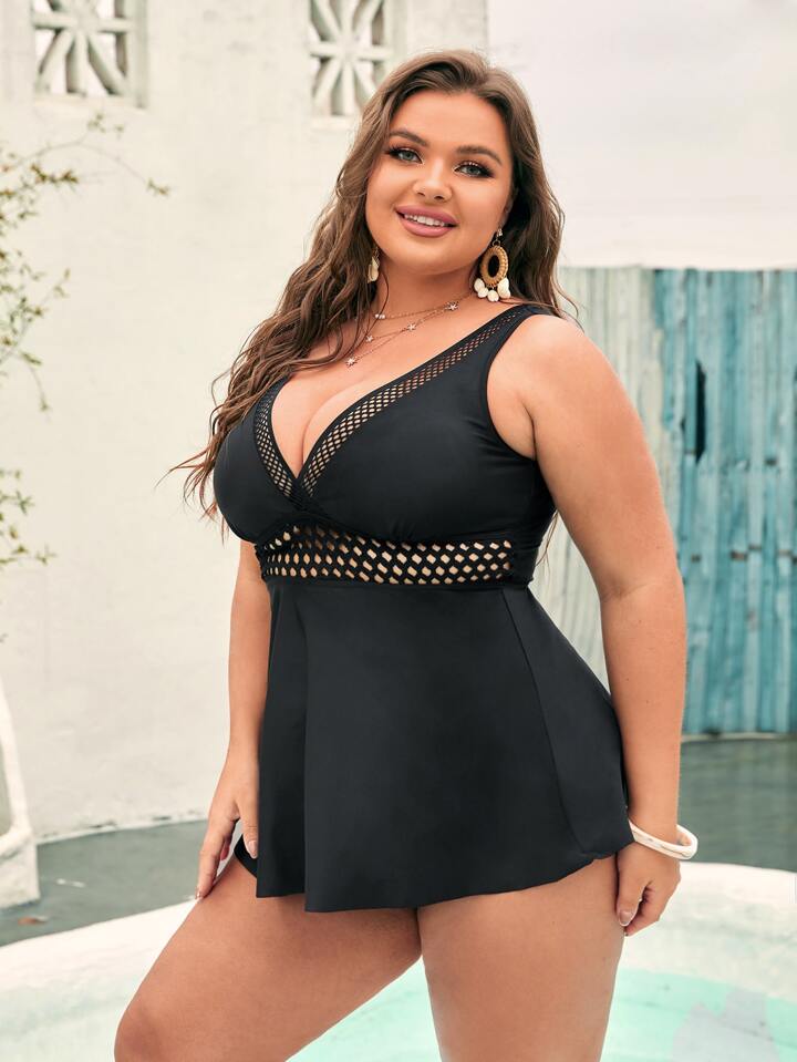 Plus Hollow-Out Trim Tankini Top With Swim Bottom, For Summer Beach Vacation