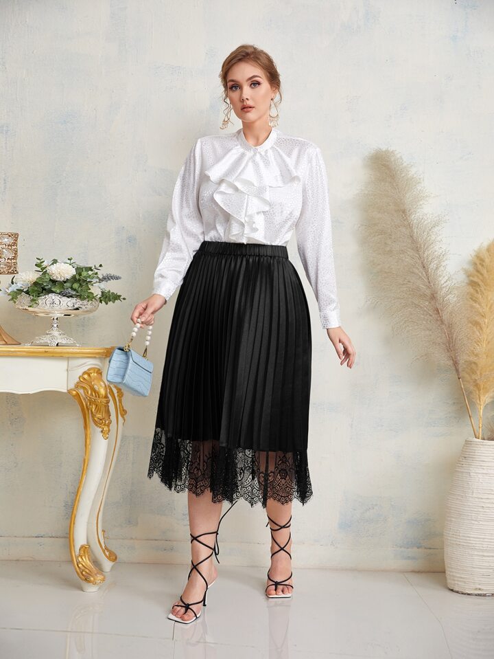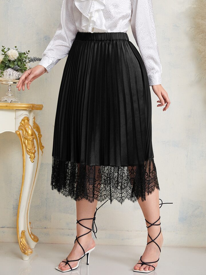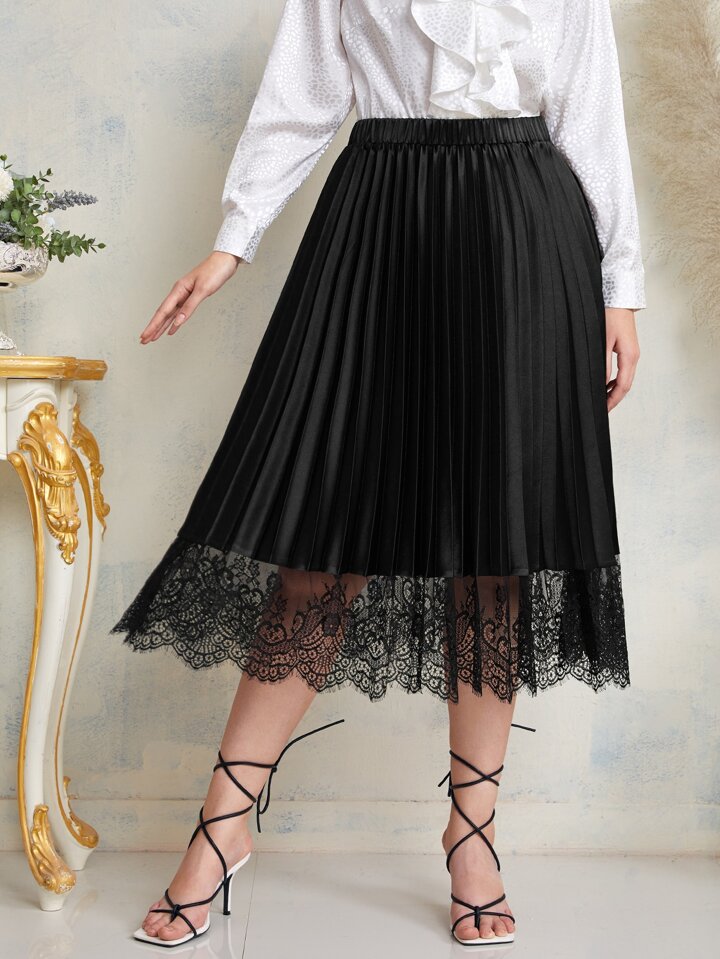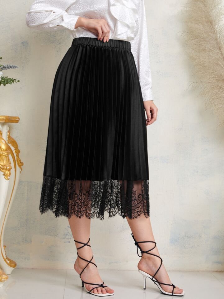 Plus Lace Trim Pleated Skirt