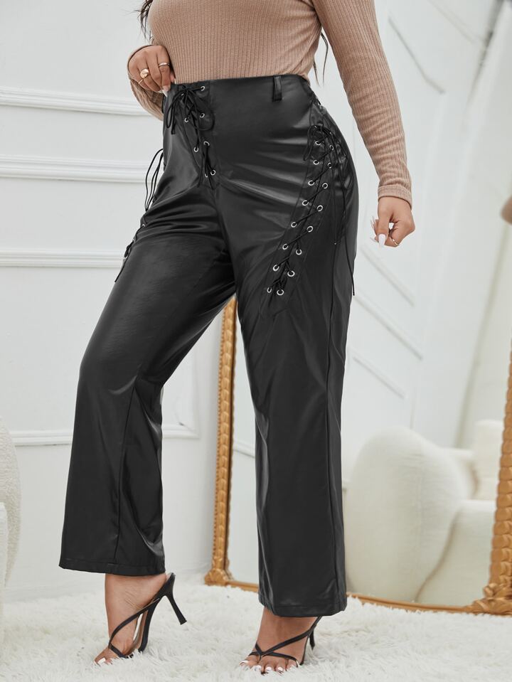 Plus Lace Up Front PU Leather Flare Leg Pants
