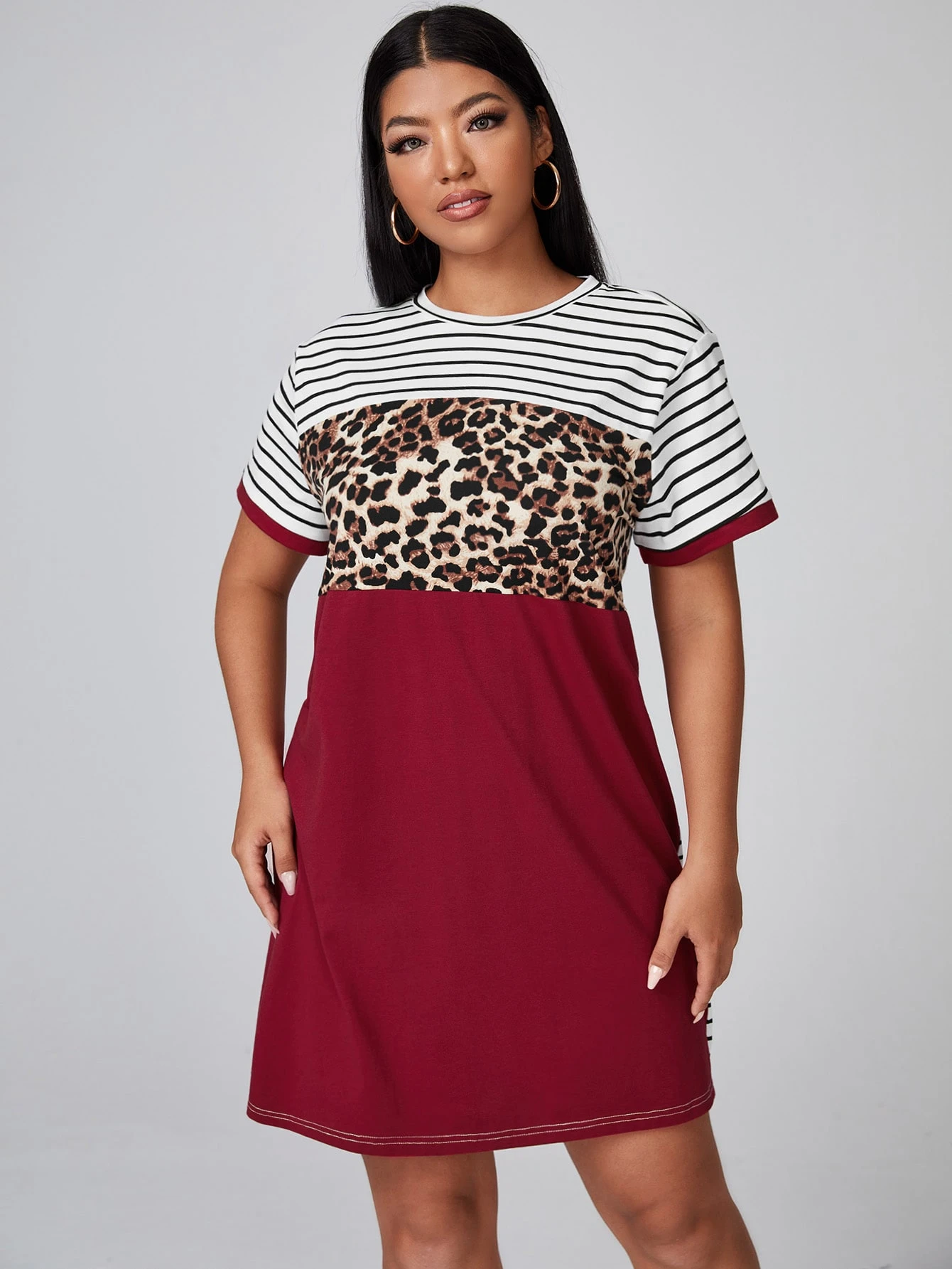 Plus Leopard & Striped Panel Colorblock Tee Dress