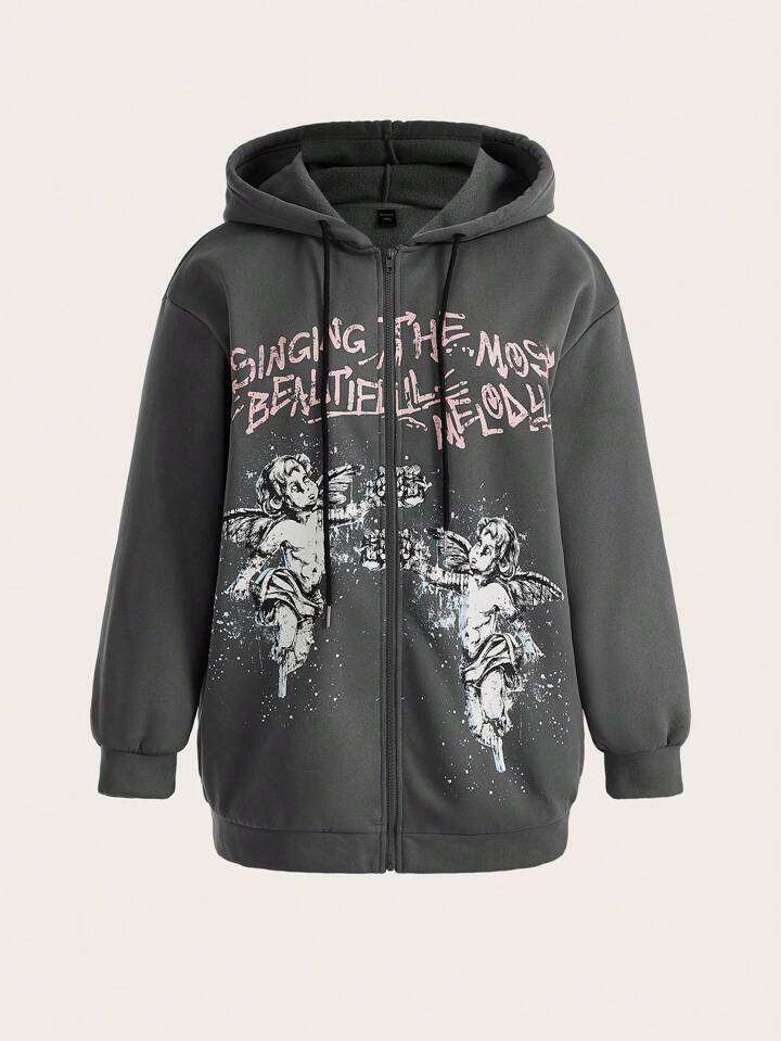 Plus Letter & Figure Graphic Zip Up Drawstring Hoodie
