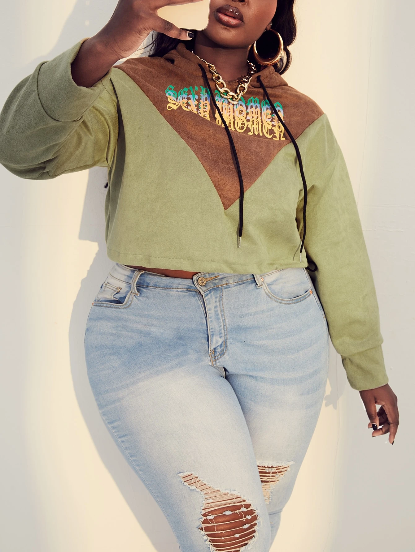 Plus Letter Graphic Colorblock Drop Shoulder Drawstring Hoodie