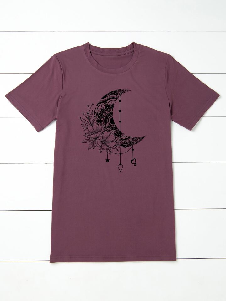 Plus Moon & Floral Print Tee Graphic Tees Women Tops