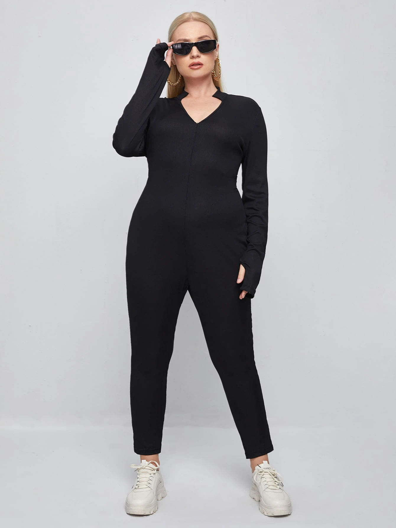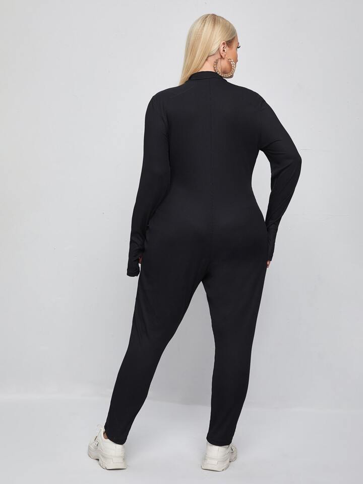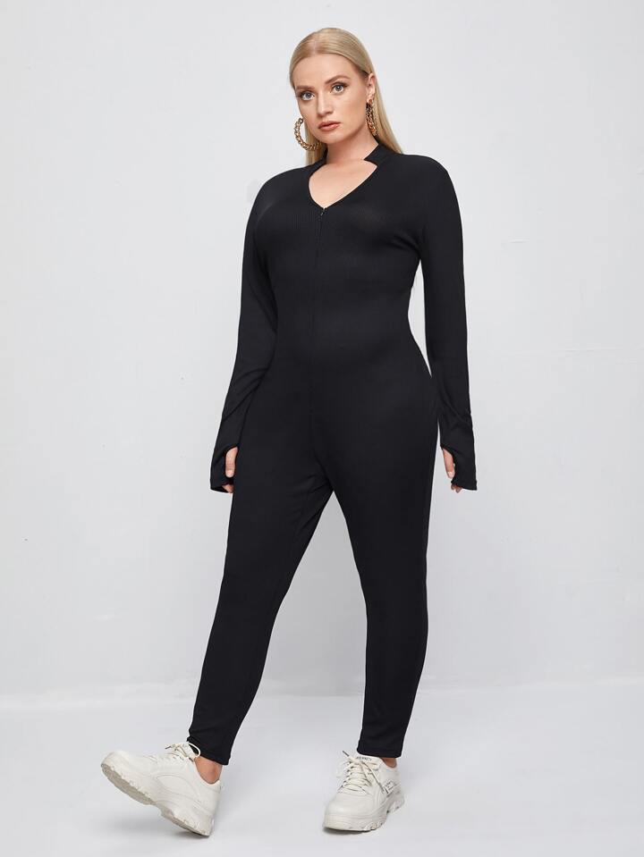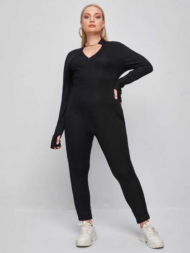 Plus Notched Neck Thumb Holes Unitard Jumpsuit