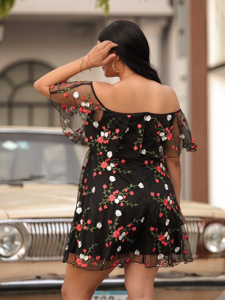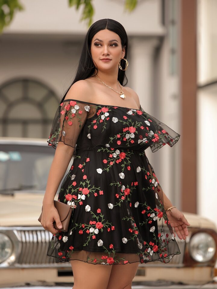 Plus Off-shoulder Floral Embroidery Mesh Dress