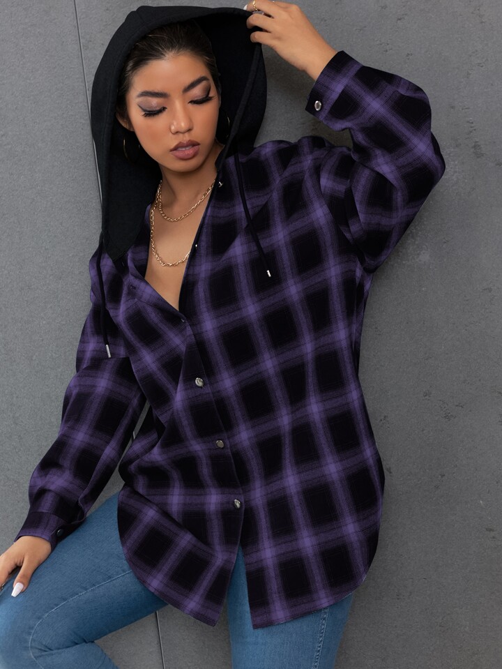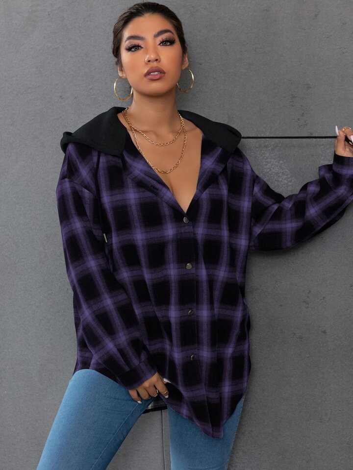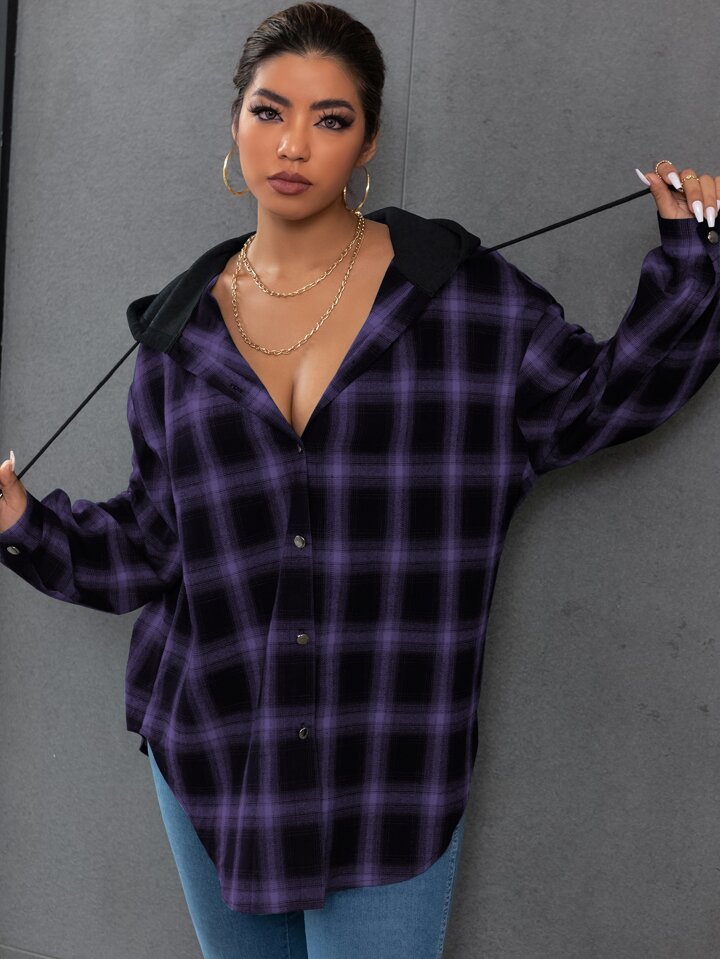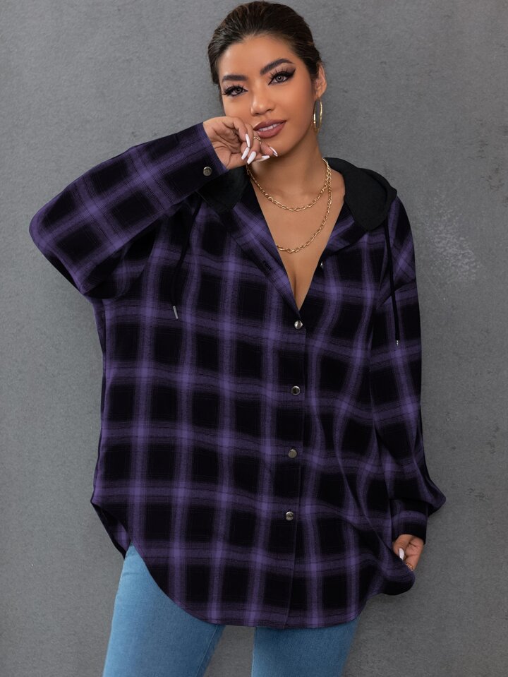Plus Plaid Drawstring Hooded Blouse Women Shirt