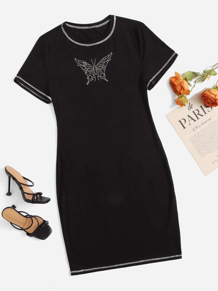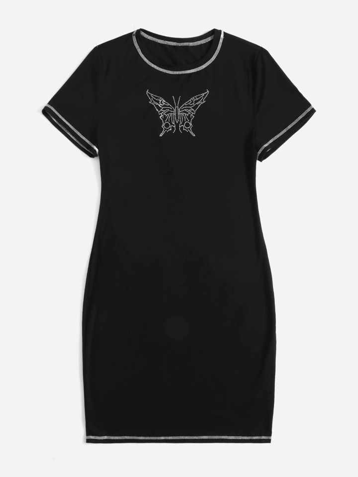 Plus Rhinestone Butterfly Pattern Top-stitching Dress