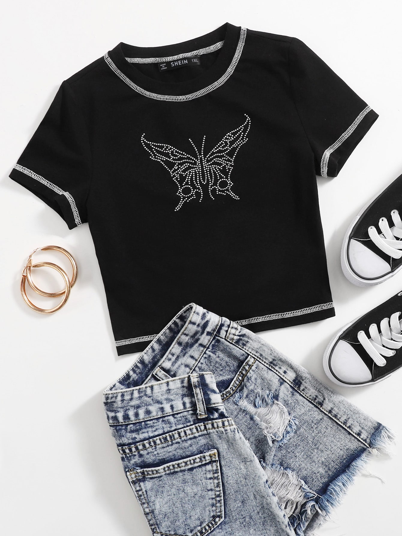 Plus Rhinestone Butterfly Pattern Top-stitching Tee