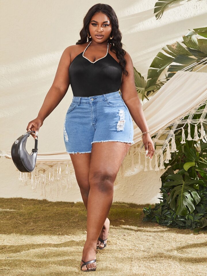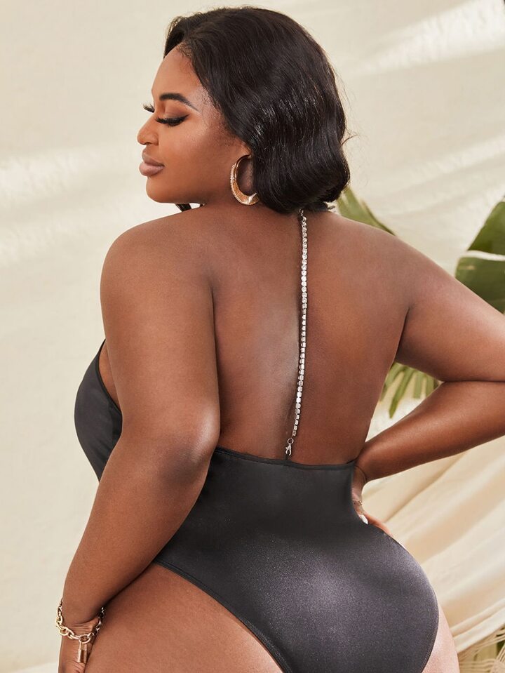Plus Rhinestone Trim Backless Halter Bodysuit