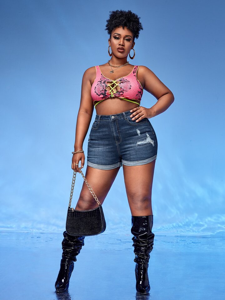 Plus Roll Up Hem High Waist Ripped Denim Shorts