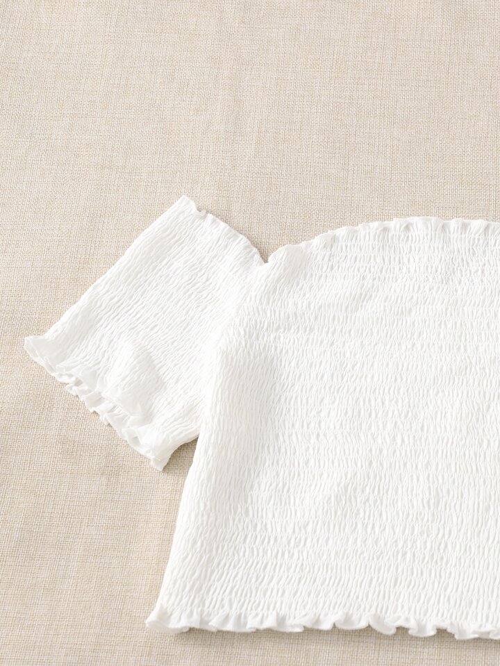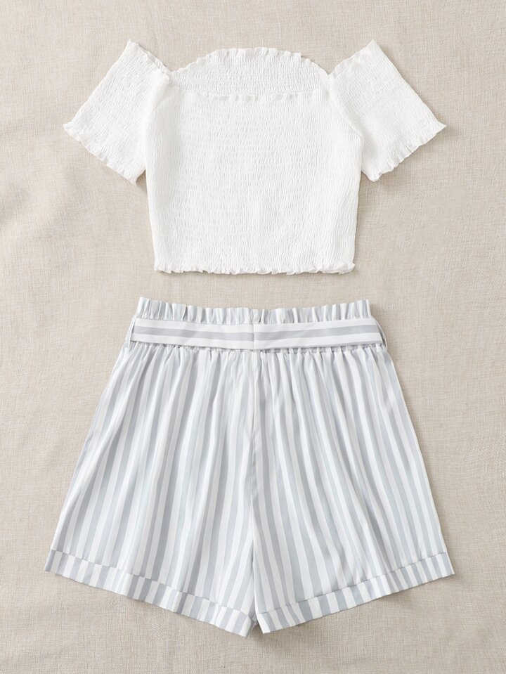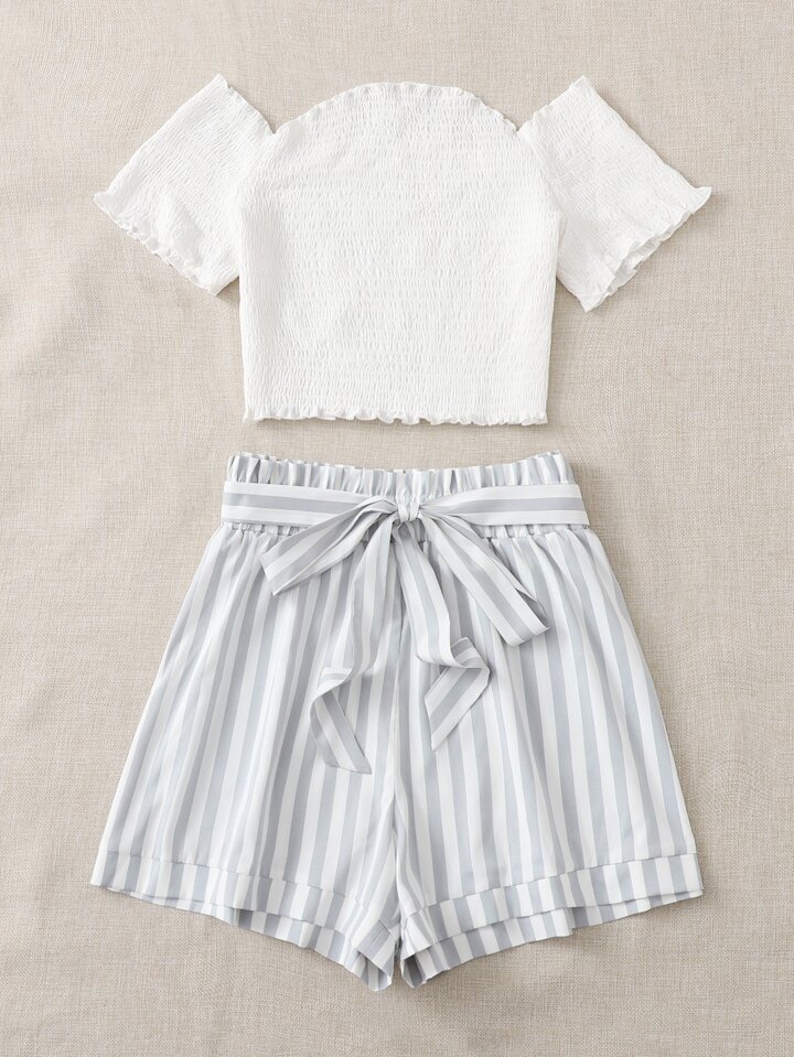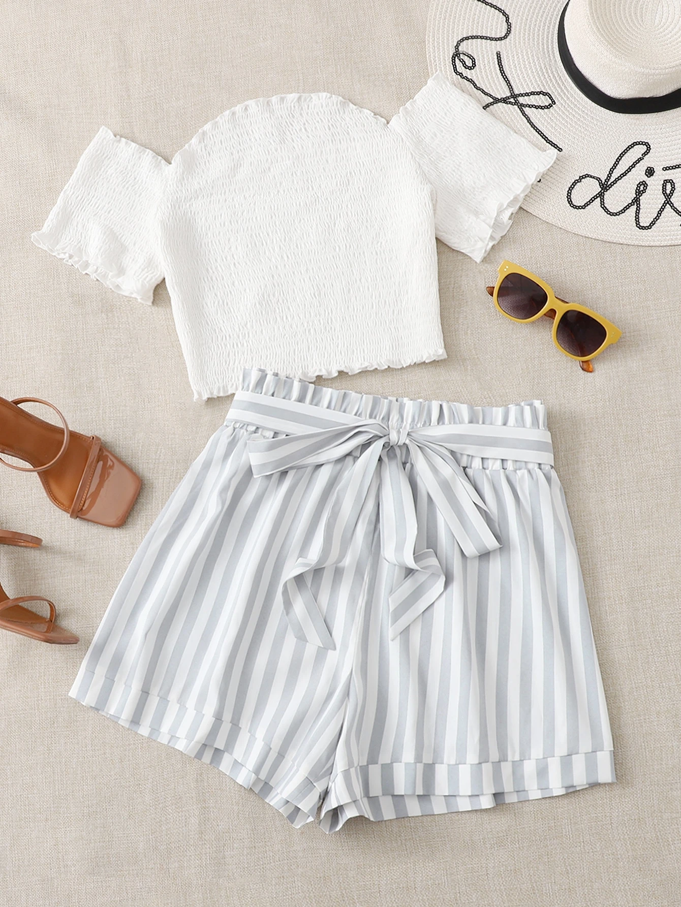 Plus Shirred Frill Off Shoulder Top & Striped Paperbag Waist Belted Shorts