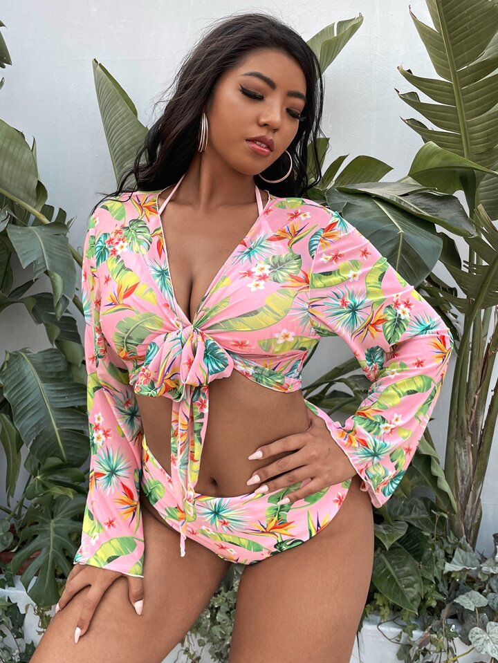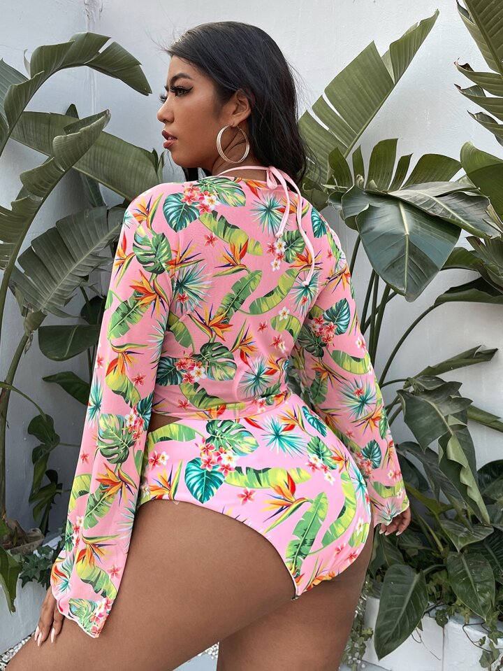 Plus Size 3packs Tropical Halter Bikini Set & Kimono Summer Beach