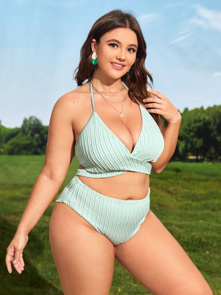 Plus Size 3packs Wrap Tie Backless Halter High Waist Bikini Set & Beach Skirt Summer Beach