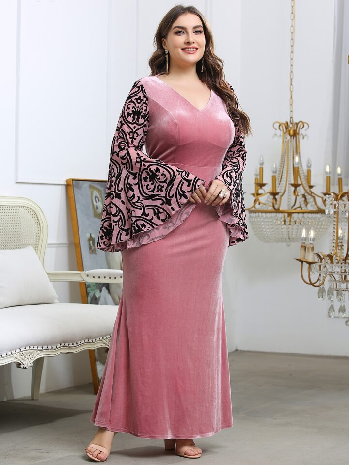 Plus Size Baroque Print Bell Sleeve Prom Dress