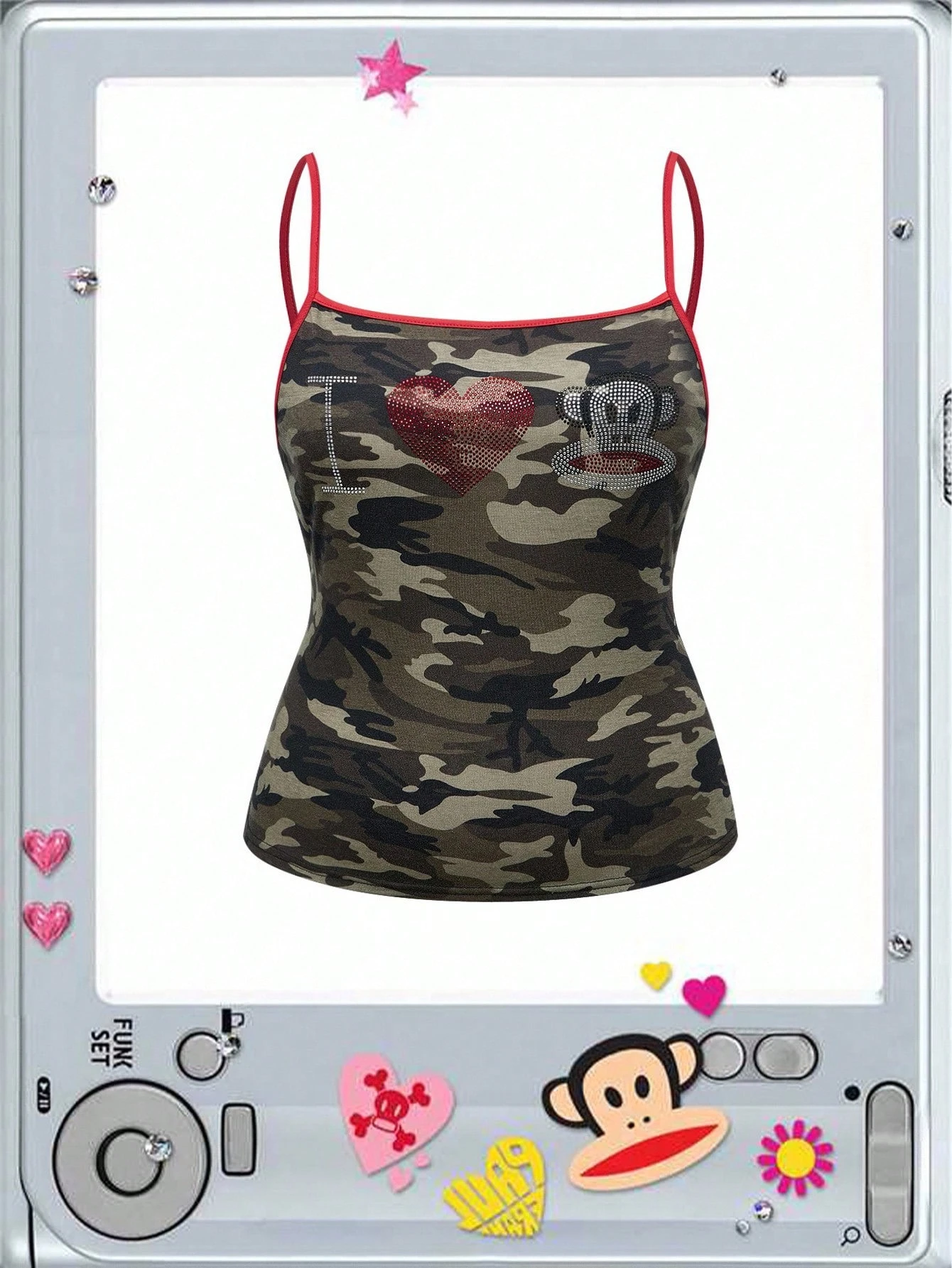 Paul Frank X ROMWE Plus Size Camouflage LOVE Rhinestone Decor Camisole Top