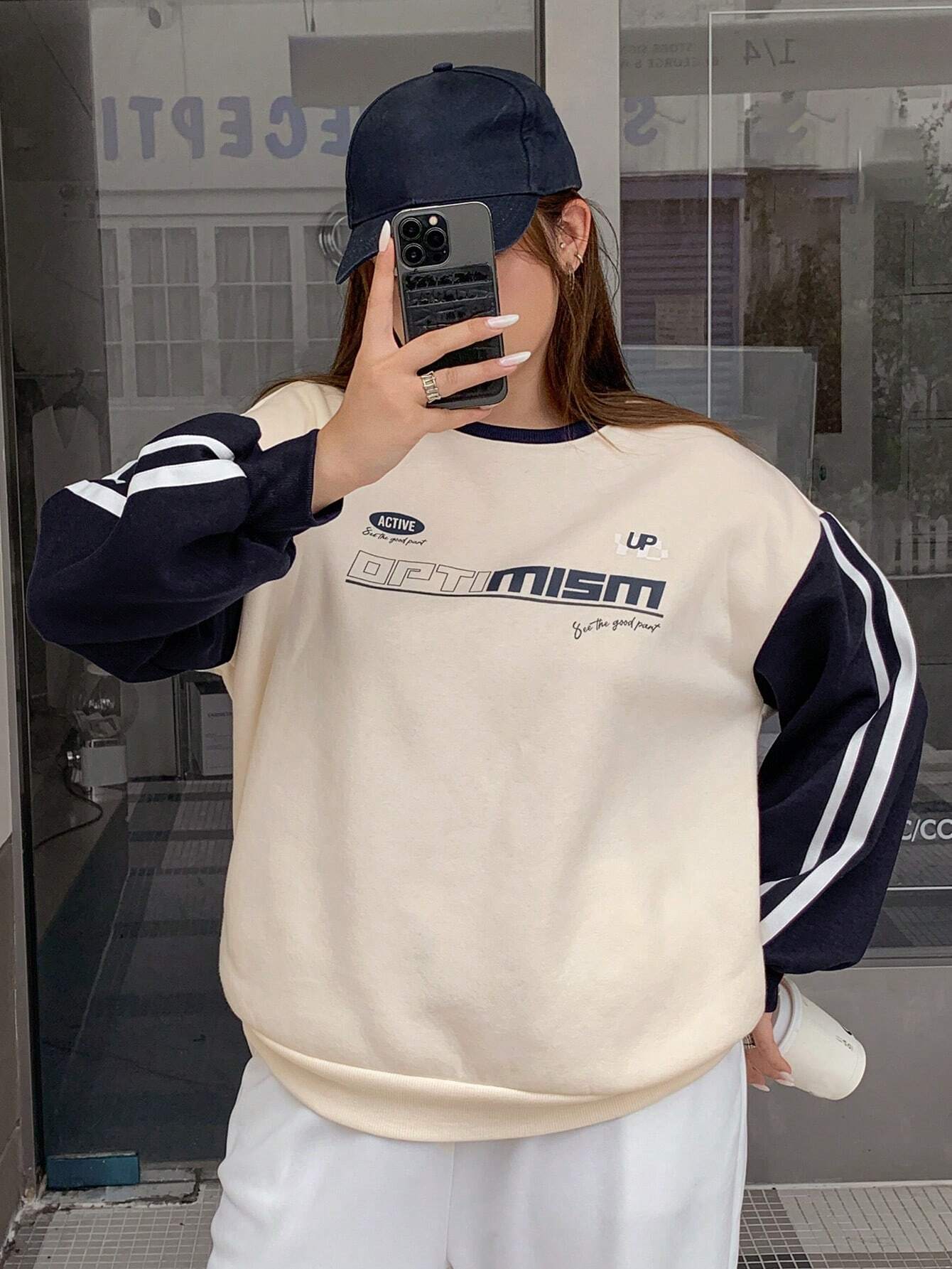 Plus Size Color-Blocking Ribbons Letter Print Loose Fit Sweatshirt, College Style,Fall Clothes