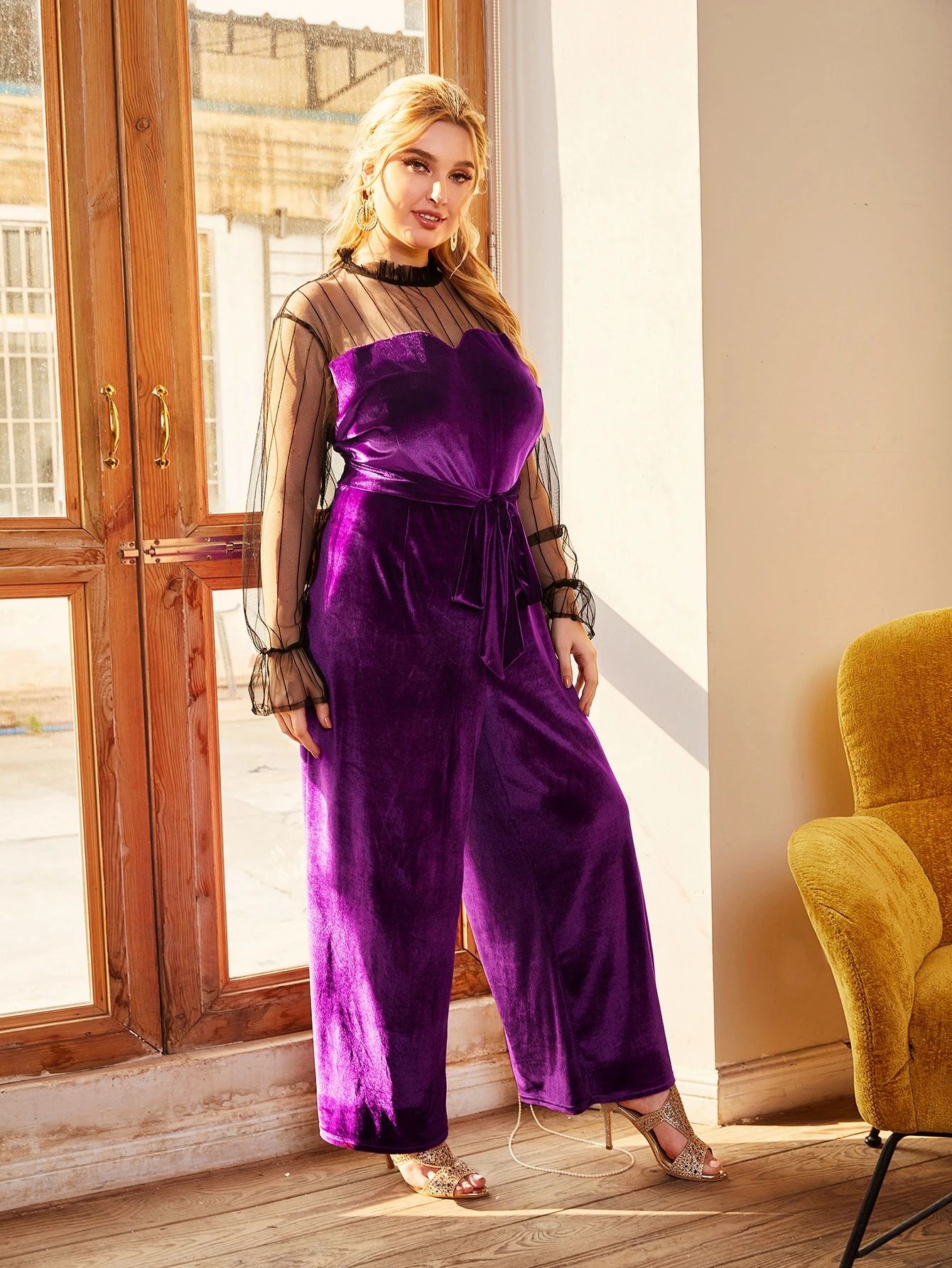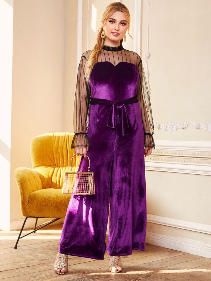 Plus Size Contrast Mesh Belted Culotte Jumpsuit