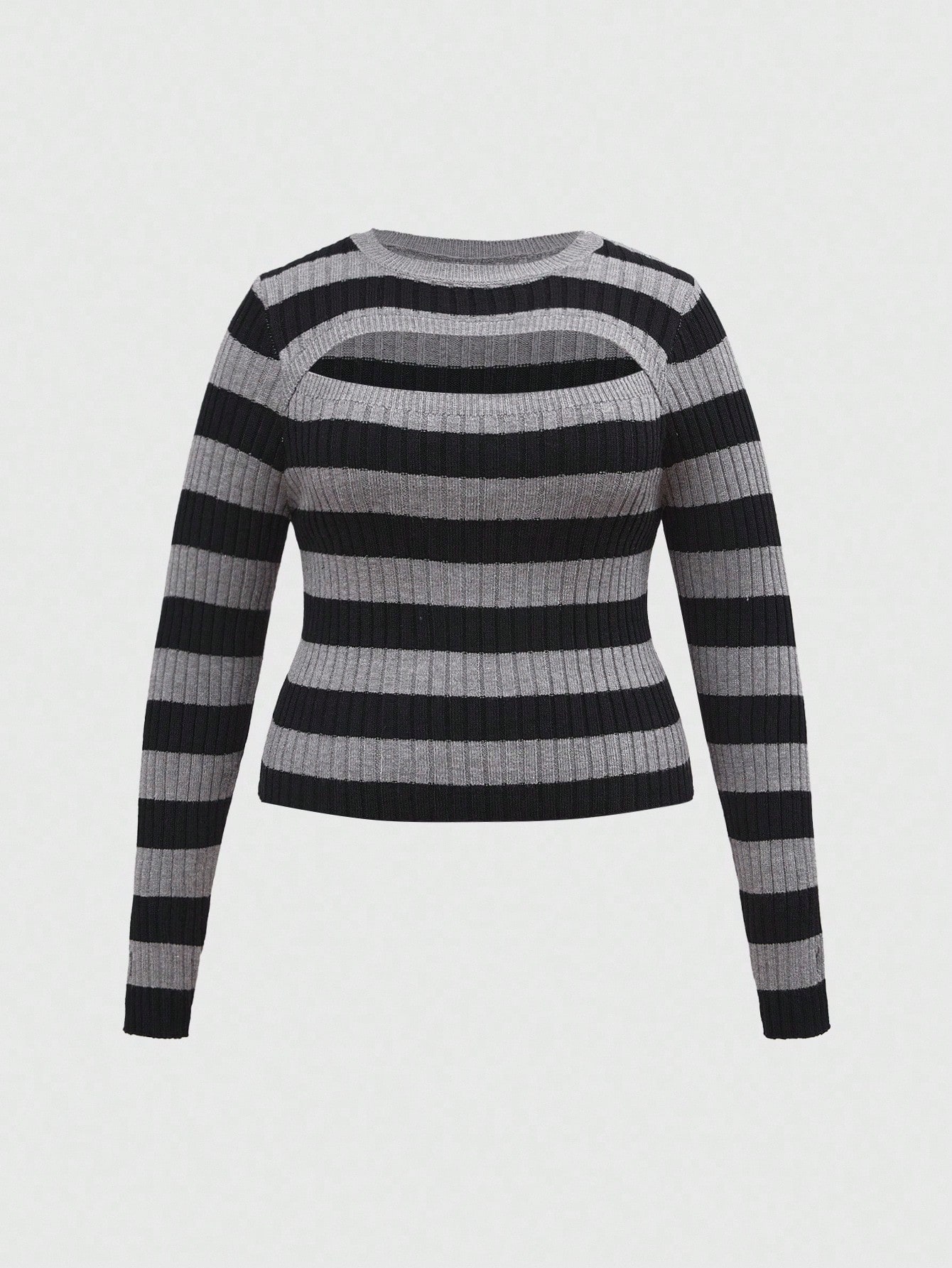Plus Size Crew Neck Hollow Out Chest Design Black & Gray Striped Long Sleeve Knit Pullover, Casual Wear For Autumn/Winter