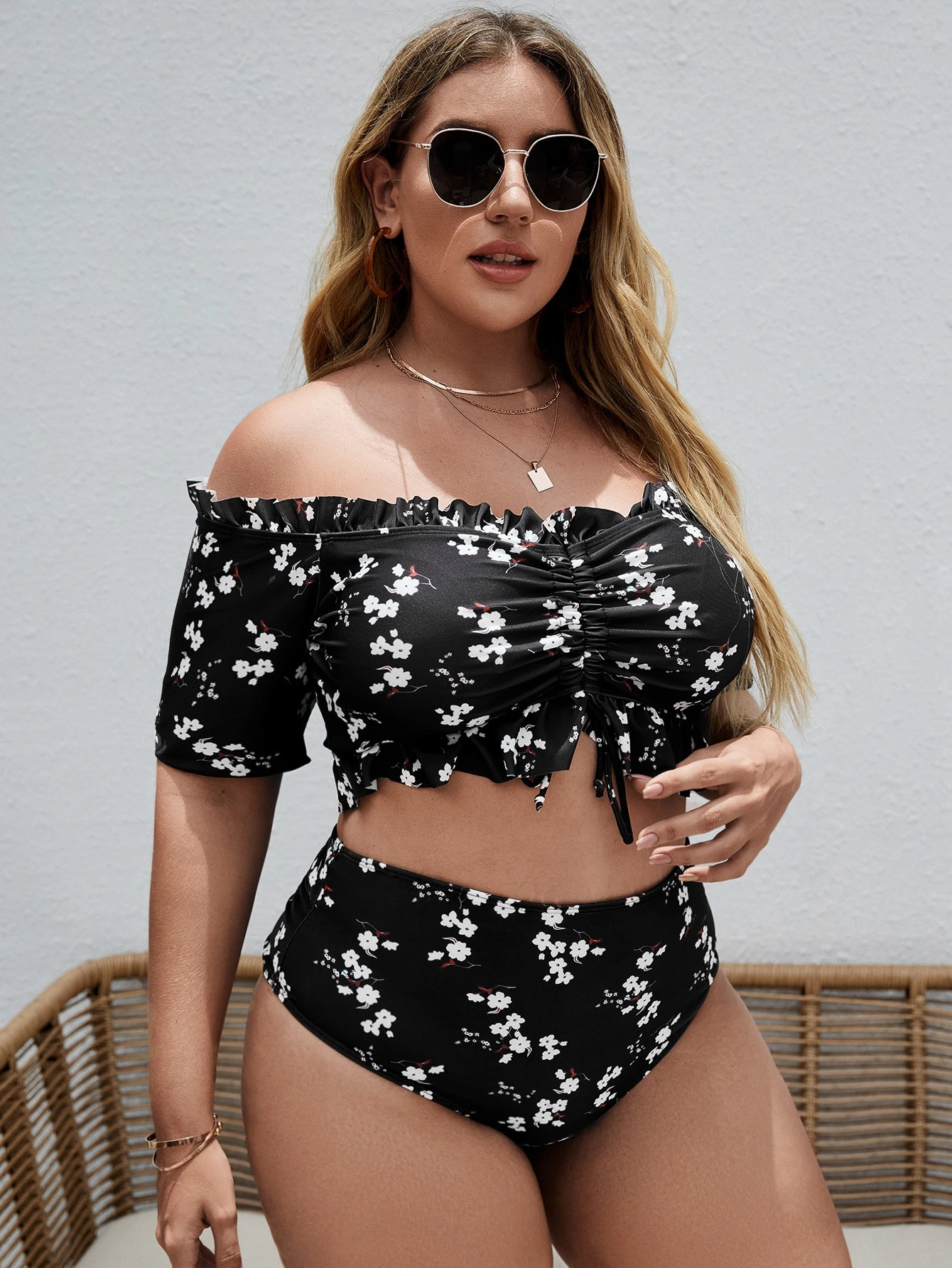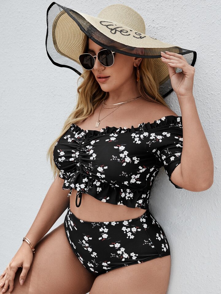 Plus Size Floral Print Frill Trim Bikini Set Summer Beach