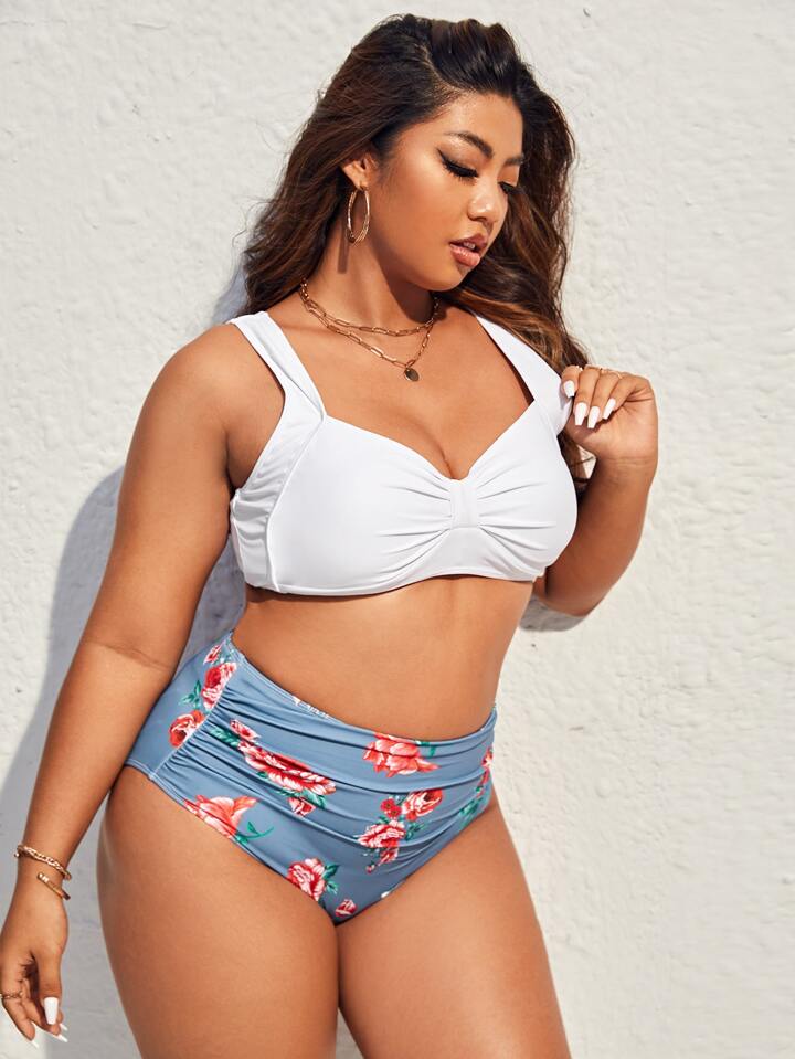 Plus Size Floral Print Ruched Bust Bikini Set Summer Beach