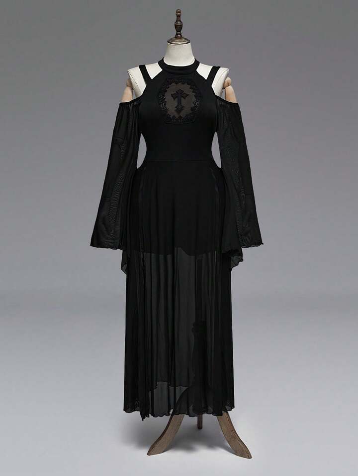 Plus Size Gothic Cross Hollow Mesh Patchwork Off-Shoulder Dress