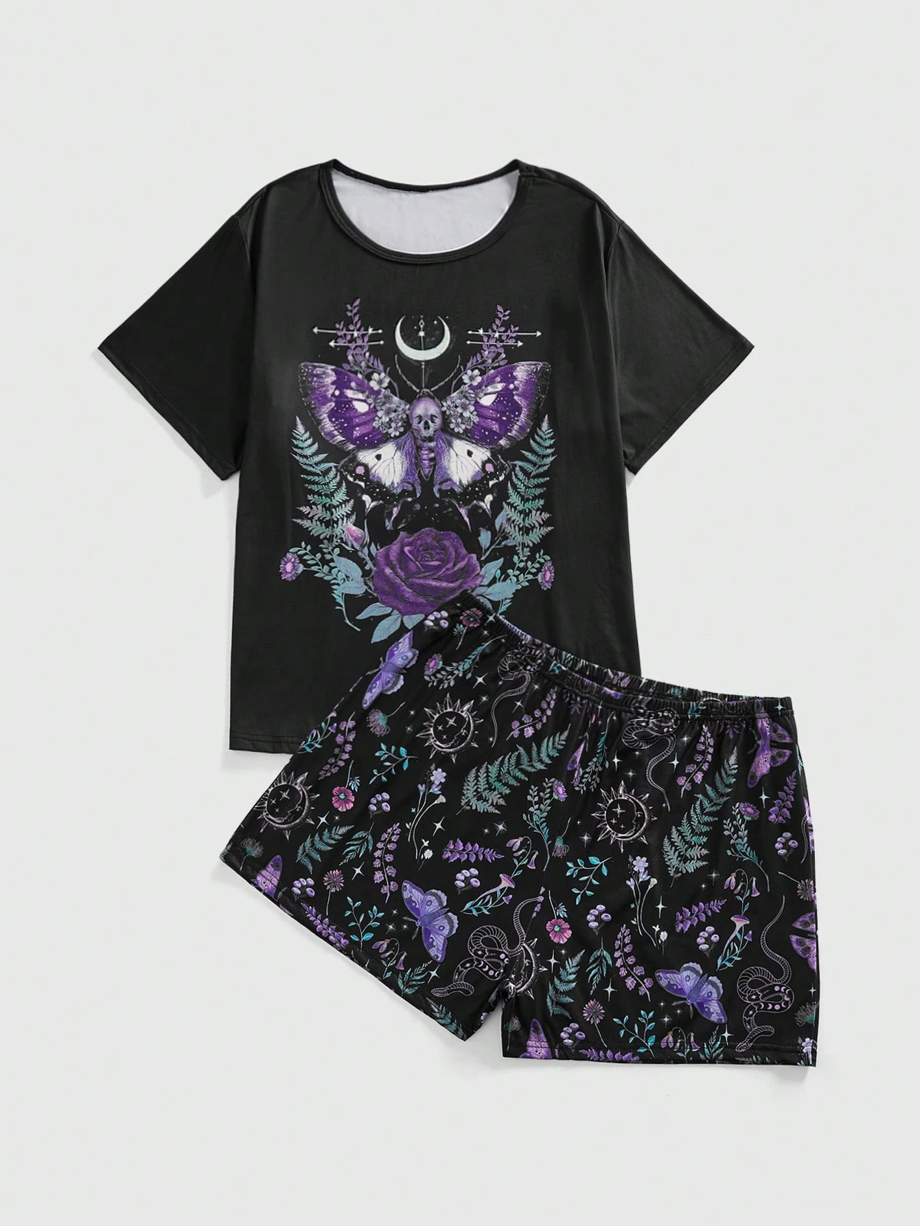 Plus Size Gothic Dark Butterfly Rose Floral Moon Moth Mushroom Botanical Snake Butterfly All-Over Print Pajama Set