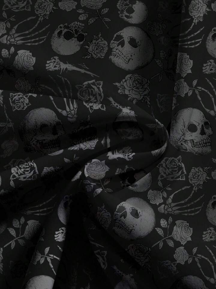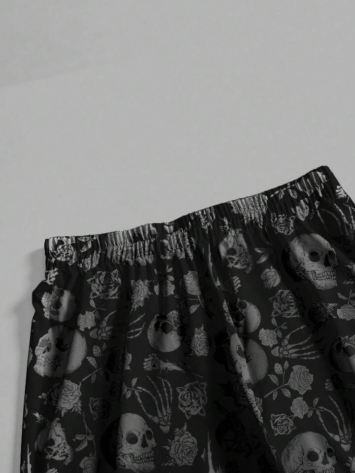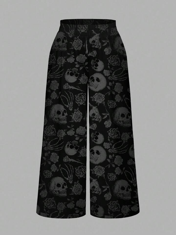 Plus Size Gothic Dark Mysterious Vintage Skull Rose Floral Print Loose Wide Leg Pants, Sexy For Valentine's Day & Halloween