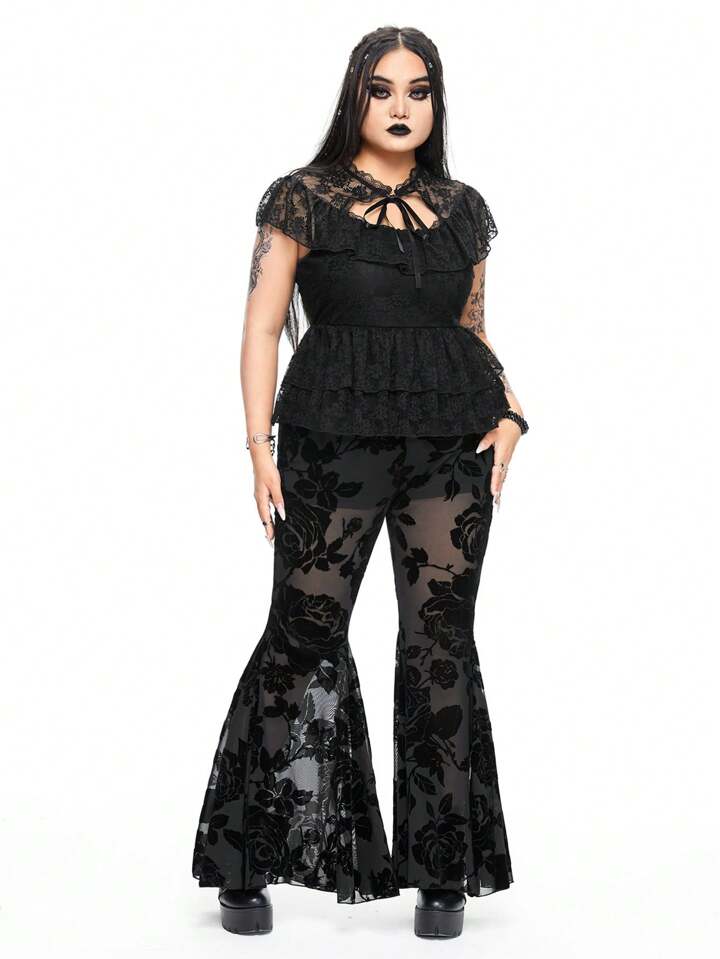 Plus Size Gothic Floral Flocking Sheer Mesh Flare Pants