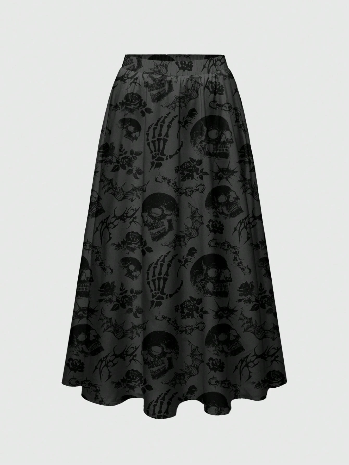 Plus Size Gothic Loose Bat, Skull, Plant PrinSkirtrt