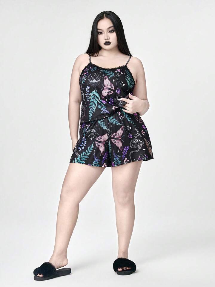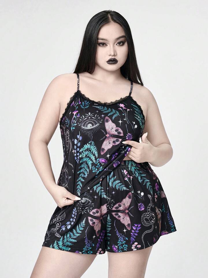 Plus Size Gothic Moth Floral Snake Plant Mushroom All-Over Print Lace Trim Satin Camisole & Shorts Pajama Set